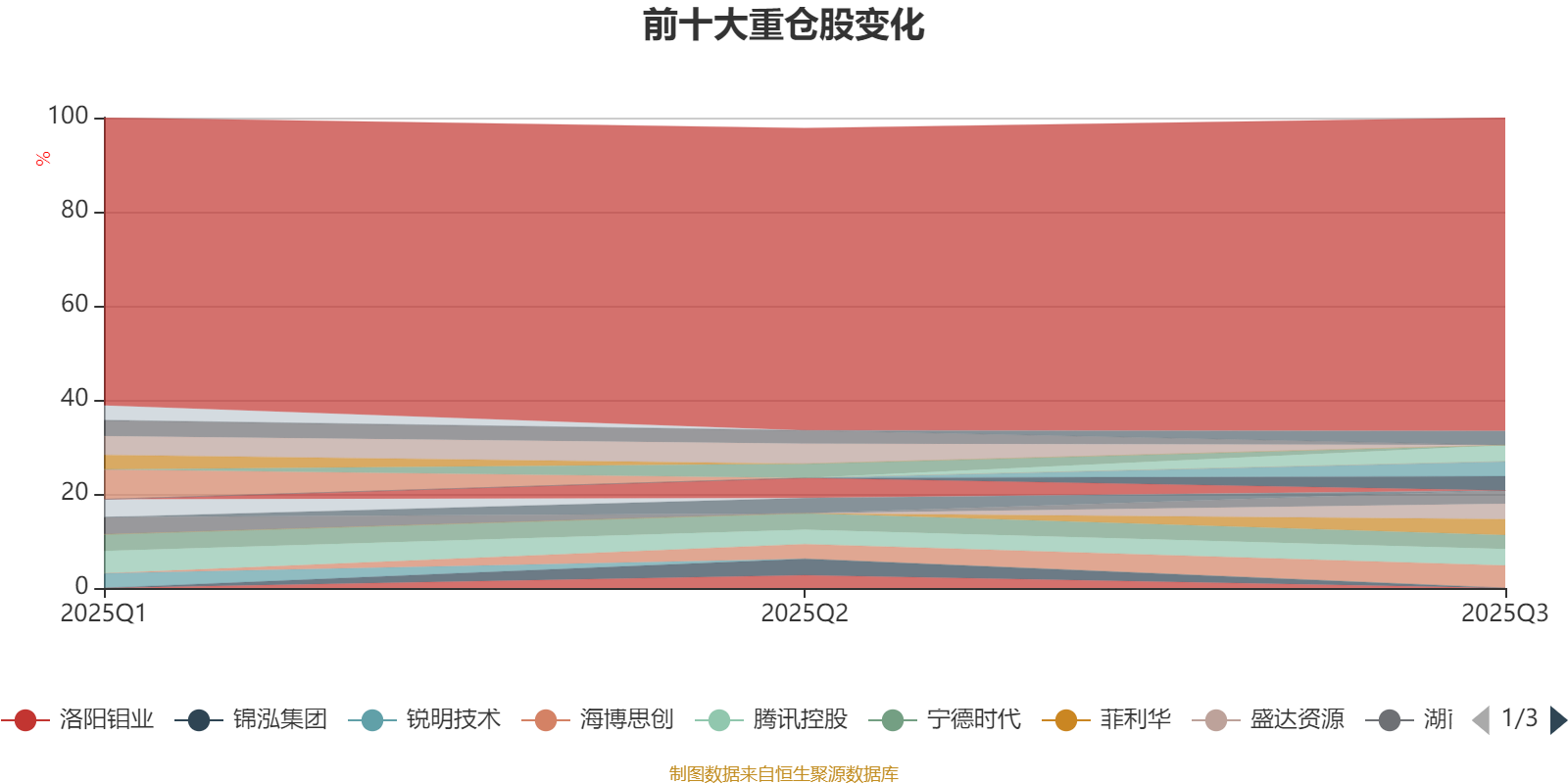 截至2025年三季度末,基金十大重仓股分别是海博思创、腾讯控股、阿里巴巴-W、菲利华、盛达资源、中芯国际、东方钽业、达瑞电子、宁德时代、湖南裕能。
