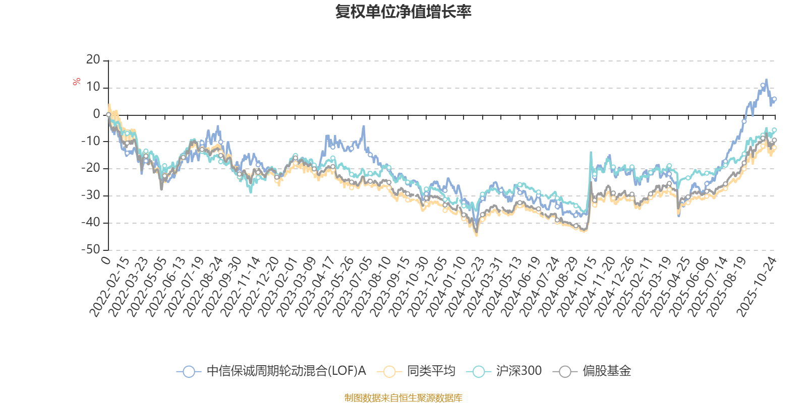截至10月24日,中信保诚周期轮动混合(LOF)A近三个月复权单位净值增长率为20.71%,位于同类可比基金82/265;近半年复权单位净值增长率为54.93%,位于同类可比基金28/265;近一年复权单位净值增长率为32.05%,位于同类可比基金98/265;近三年复权单位净值增长率为25.83%,位于同类可比基金89/253。