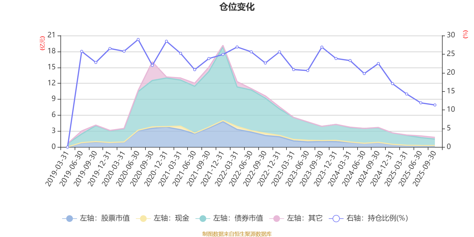 据定期报告数据统计,近三年平均股票仓位为19.82%,同类平均为19.03%。2020年上半年末基金达到28.94%的最高仓位,2025年三季度末最低,为11.33%。