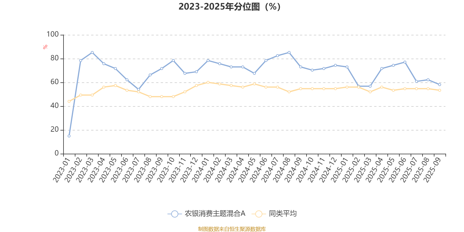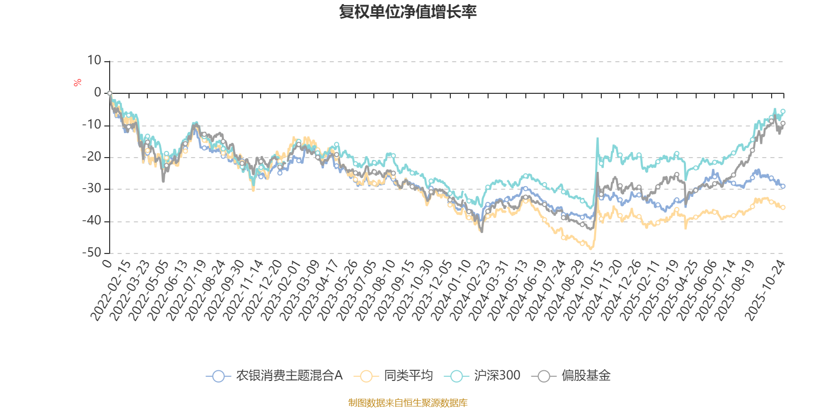 截至10月24日,农银消费主题混合A近三个月复权单位净值增长率为-0.35%,位于同类可比基金53/85;近半年复权单位净值增长率为1.57%,位于同类可比基金62/85;近一年复权单位净值增长率为4.36%,位于同类可比基金48/82;近三年复权单位净值增长率为-3.53%,位于同类可比基金38/74。