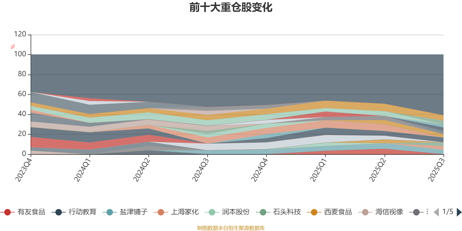 截至2025年三季度末,基金十大重仓股分别是东鹏饮料、太阳纸业、盐津铺子、石头科技、科沃斯、上海家化、匠心家居、潮宏基、泸州老窖、吉比特。