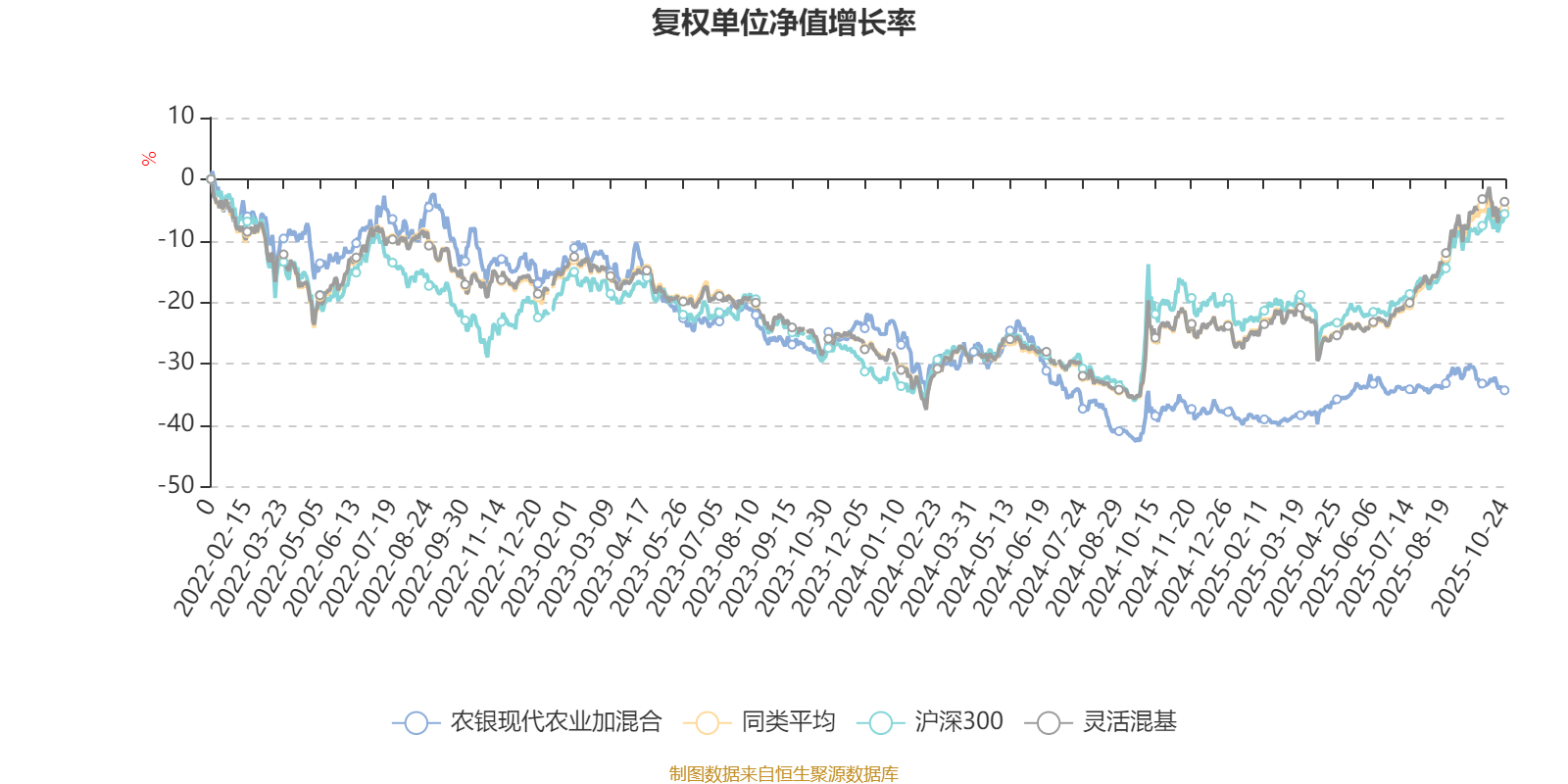 截至10月24日,农银现代农业加混合近三个月复权单位净值增长率为-0.88%,位于同类可比基金1225/1287;近半年复权单位净值增长率为1.83%,位于同类可比基金1245/1287;近一年复权单位净值增长率为5.31%,位于同类可比基金1115/1287;近三年复权单位净值增长率为-24.71%,位于同类可比基金1235/1286。