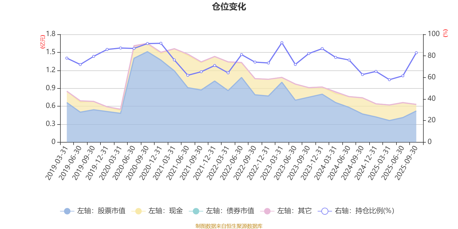 据定期报告数据统计,近三年平均股票仓位为74.35%,同类平均为72.16%。2023年一季度末基金达到92.25%的最高仓位,2025年一季度末最低,为57.93%。