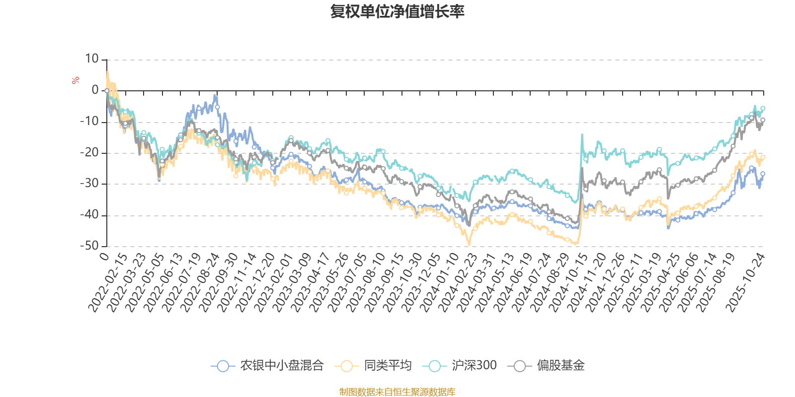 截至10月24日,农银中小盘混合近三个月复权单位净值增长率为17.27%,位于同类可比基金227/621;近半年复权单位净值增长率为24.92%,位于同类可比基金359/618;近一年复权单位净值增长率为16.49%,位于同类可比基金468/611;近三年复权单位净值增长率为-13.32%,位于同类可比基金474/518。