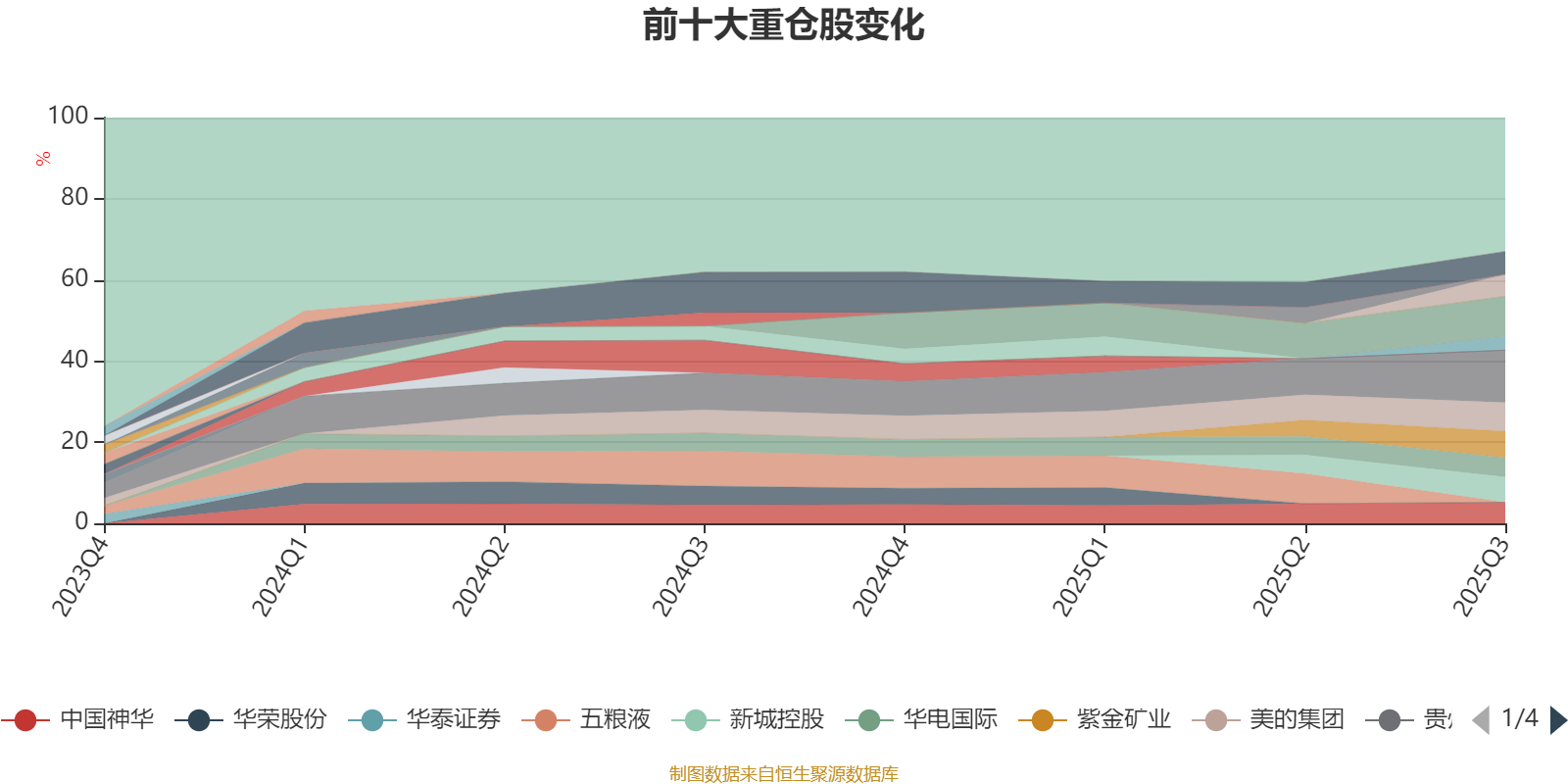 截至2025年三季度末,基金十大重仓股分别是贵州茅台、中国海油、美的集团、紫金矿业、新城控股、宝丰能源、药明康德、中国神华、华电国际、亚钾国际。