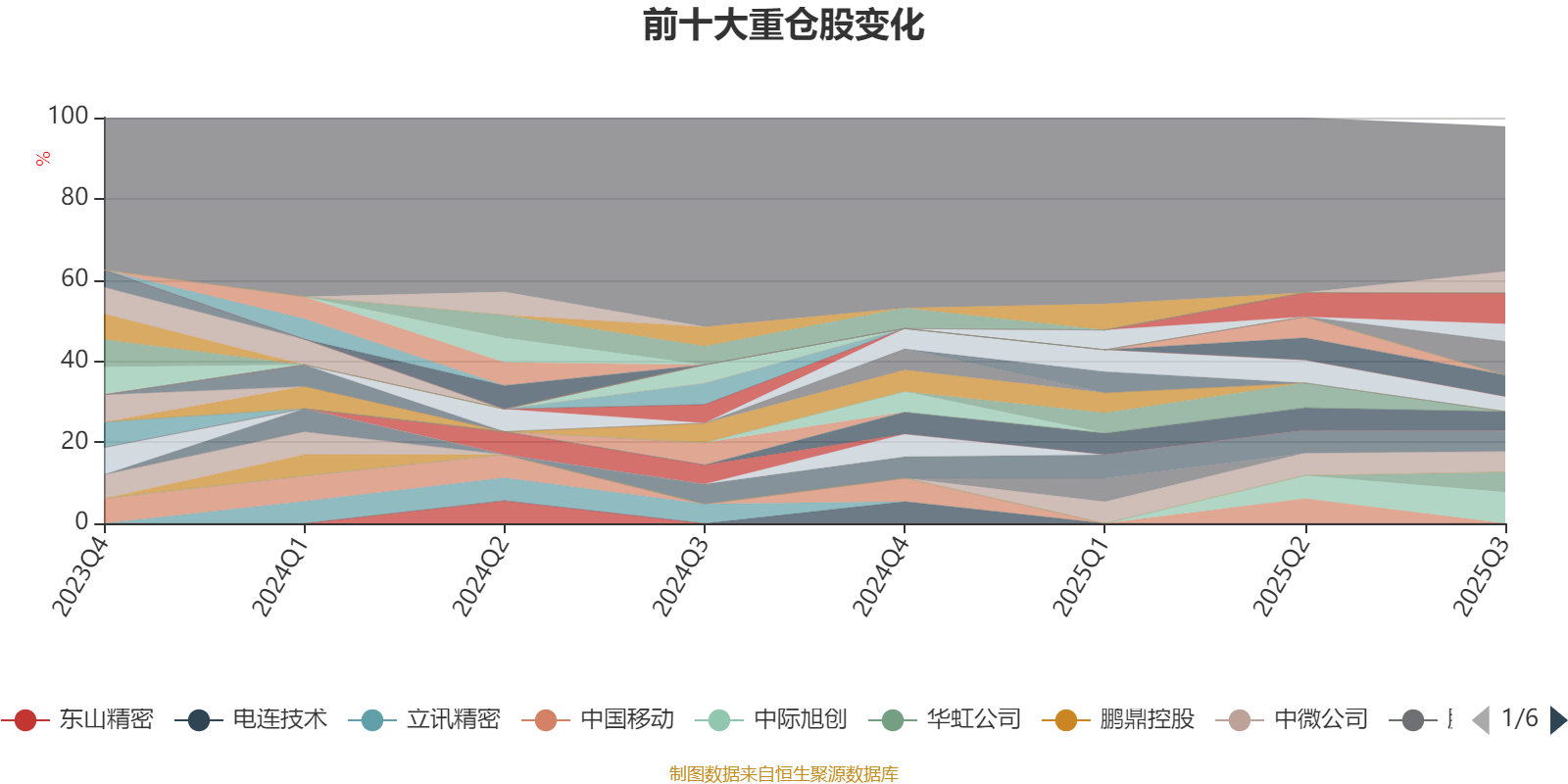 截至2025年三季度末,基金十大重仓股分别是工业富联、中际旭创、新易盛、兆易创新、沪电股份、北方华创、中微公司、华虹公司、寒武纪、华虹半导体、中芯国际。