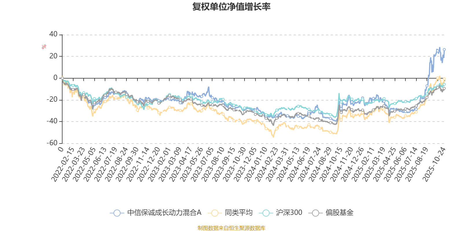 截至10月24日,中信保诚成长动力混合A近三个月复权单位净值增长率为63.45%,位于同类可比基金8/229;近半年复权单位净值增长率为77.85%,位于同类可比基金47/229;近一年复权单位净值增长率为67.14%,位于同类可比基金53/213;近三年复权单位净值增长率为58.44%,位于同类可比基金54/158。