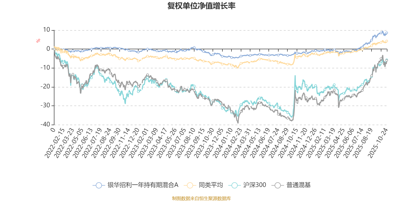 截至10月24日,银华招利一年持有期混合A近三个月复权单位净值增长率为5.72%,位于同类可比基金74/629;近半年复权单位净值增长率为10.36%,位于同类可比基金74/629;近一年复权单位净值增长率为11.11%,位于同类可比基金106/623;近三年复权单位净值增长率为8.61%,位于同类可比基金377/556。