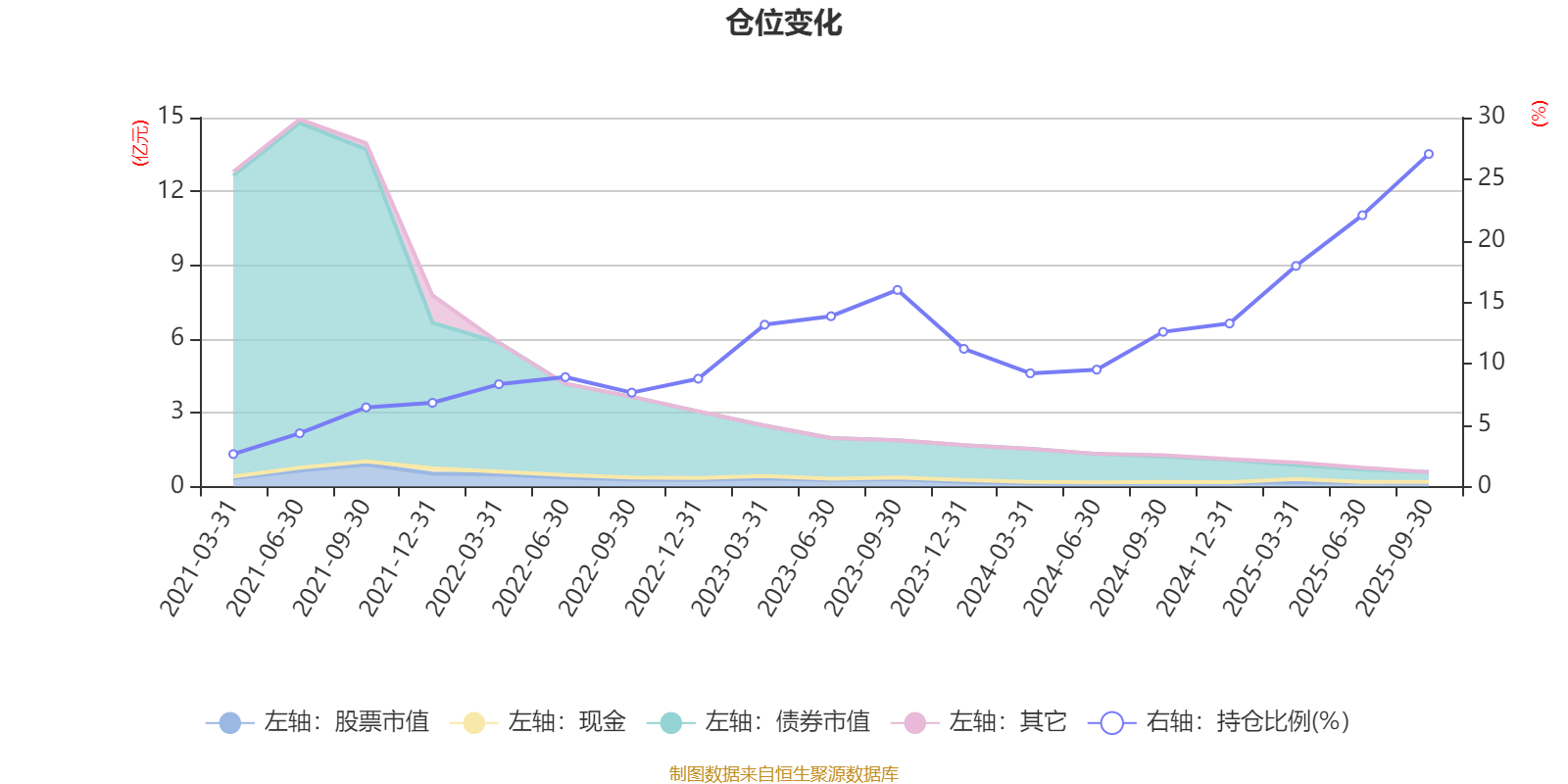 据定期报告数据统计,近三年平均股票仓位为14.55%,同类平均为19.03%。2025年三季度末基金达到27.04%的最高仓位,2021年一季度末最低,为2.64%。