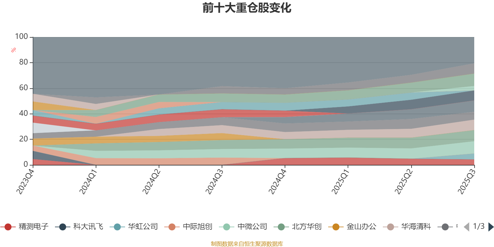 该基金持股集中度较高。截至2025年三季度末,基金重仓股分别是拓荆科技、中微公司、芯源微、北方华创、华海清科、富创精密、江淮汽车、中科飞测、华虹公司、精测电子、华虹半导体。