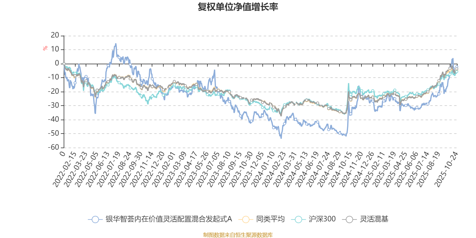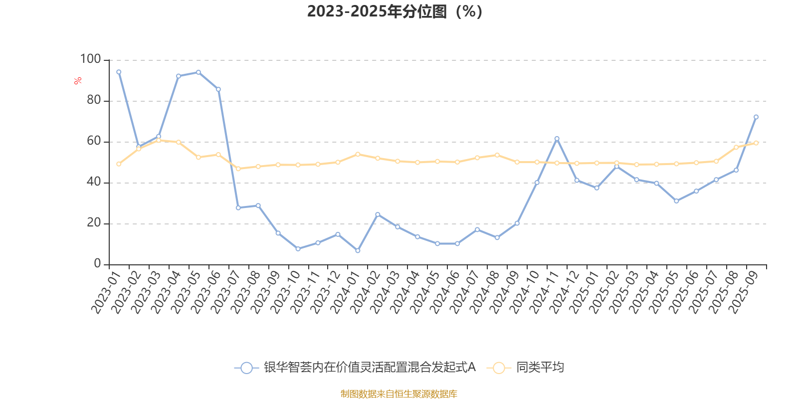 截至10月24日,银华智荟内在价值灵活配置混合发起式A近三个月复权单位净值增长率为27.11%,位于同类可比基金195/1287;近半年复权单位净值增长率为40.48%,位于同类可比基金230/1287;近一年复权单位净值增长率为44.41%,位于同类可比基金200/1287;近三年复权单位净值增长率为14.54%,位于同类可比基金621/1286。