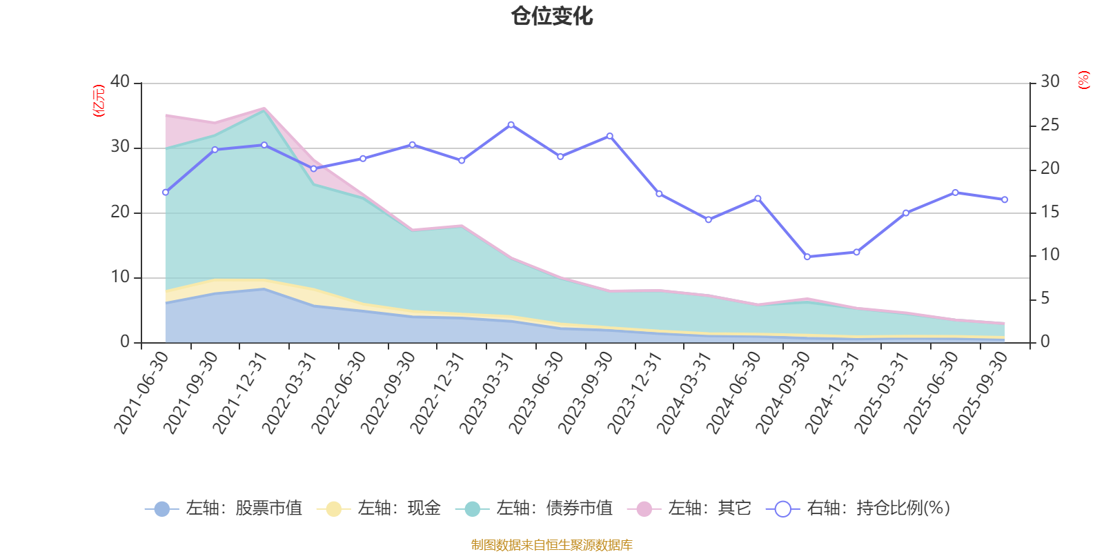 据定期报告数据统计,近三年平均股票仓位为17.4%,同类平均为19.03%。2023年一季度末基金达到25.16%的最高仓位,2024年三季度末最低,为9.91%。