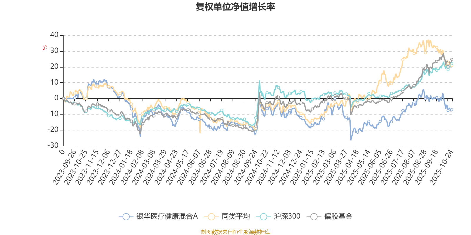 截至10月24日,银华医疗健康混合A近三个月复权单位净值增长率为-1.63%,位于同类可比基金34/106;近半年复权单位净值增长率为16.61%,位于同类可比基金65/104;近一年复权单位净值增长率为-0.29%,位于同类可比基金98/101。