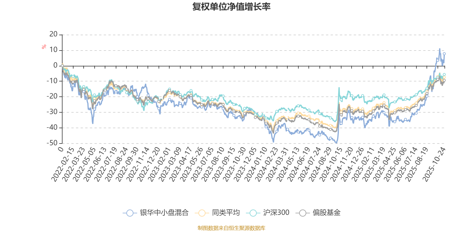 截至10月24日,银华中小盘混合近三个月复权单位净值增长率为49.45%,位于同类可比基金3/130;近半年复权单位净值增长率为68.87%,位于同类可比基金7/130;近一年复权单位净值增长率为63.47%,位于同类可比基金4/130;近三年复权单位净值增长率为25.15%,位于同类可比基金53/124。