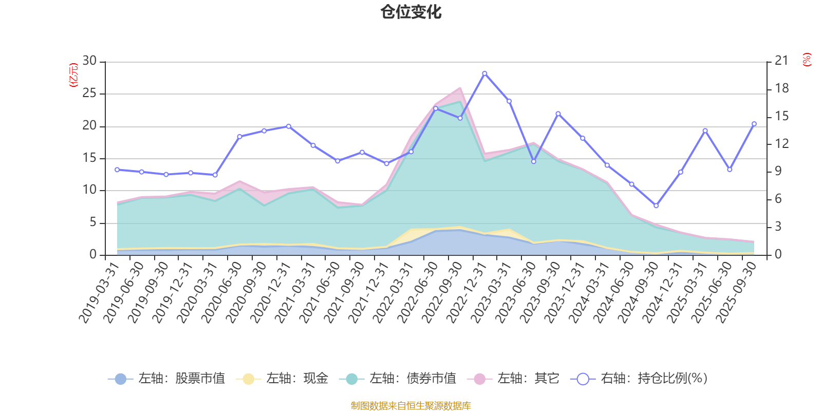 据定期报告数据统计,近三年平均股票仓位为11.96%,同类平均为72.16%。2022年末基金达到19.72%的最高仓位,2024年三季度末最低,为5.37%。