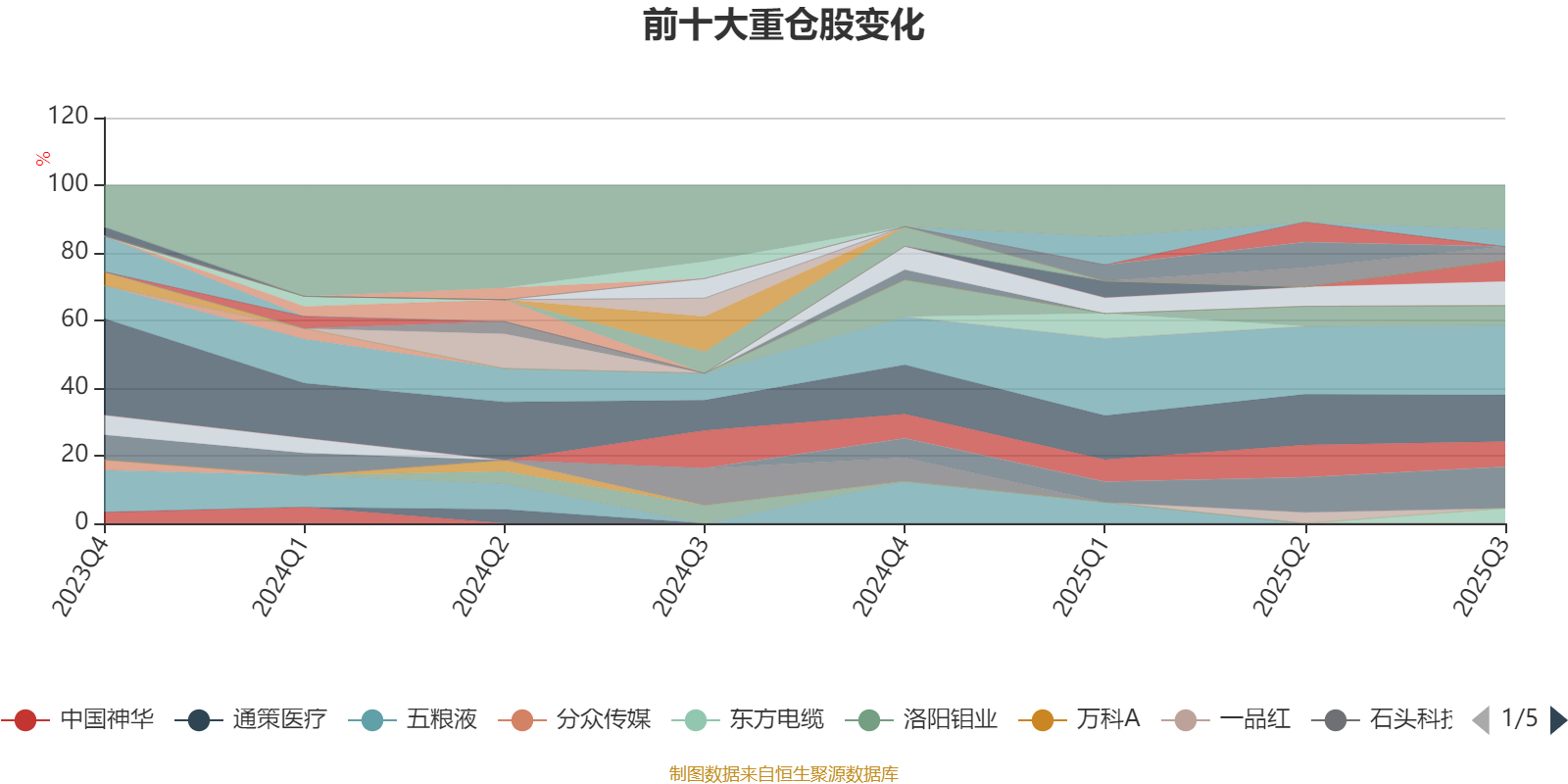 该基金持股集中度较高,近2年前十大重仓股集中度长期超过60%。截至2025年三季度末,基金十大重仓股分别是宁德时代、贵州茅台、紫金矿业、美的集团、药明康德、晋控煤业、迈瑞医疗、山西汾酒、东方电缆、益方生物。