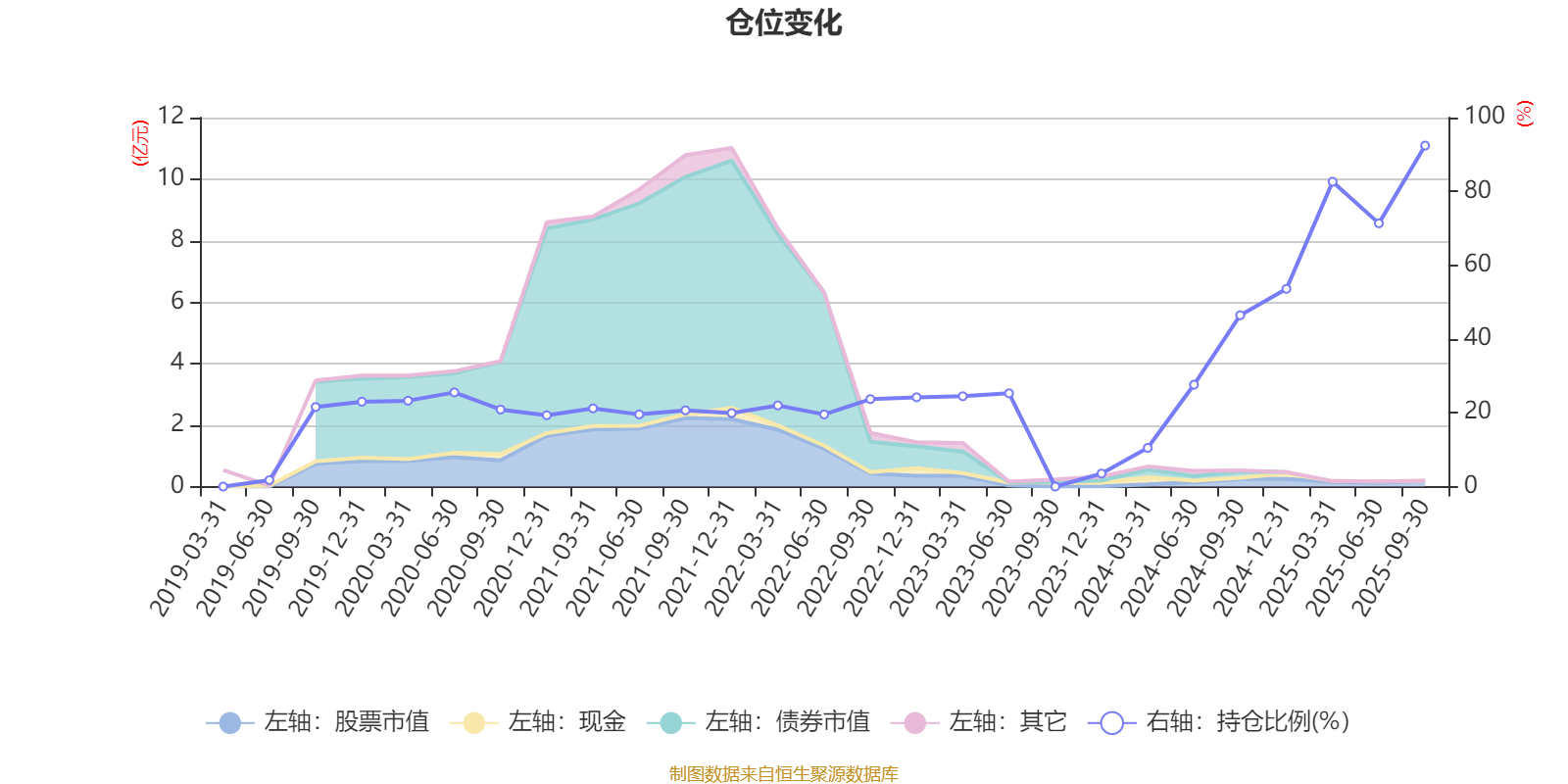 据定期报告数据统计,近三年平均股票仓位为38.5%,同类平均为72.16%。2025年三季度末基金达到92.41%的最高仓位,2019年上半年末最低,为1.75%。