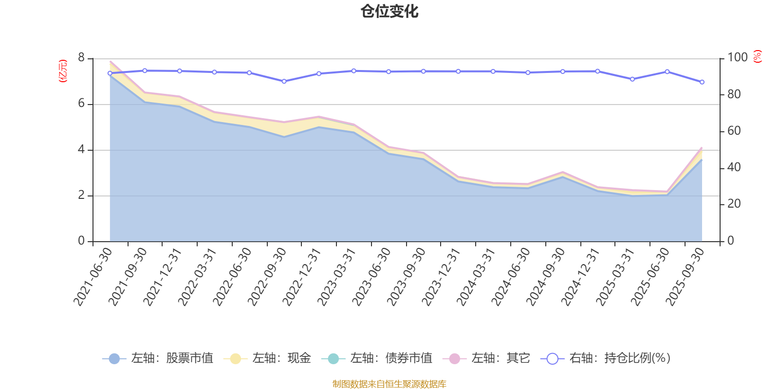 据定期报告数据统计,近三年平均股票仓位为91.89%,同类平均为85.51%。2021年三季度末基金达到93.3%的最高仓位,2025年三季度末最低,为87.06%。