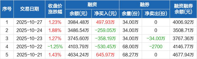 新能源ETF:融资净买入497.93万元,融资余额3984.48万元(10-27)