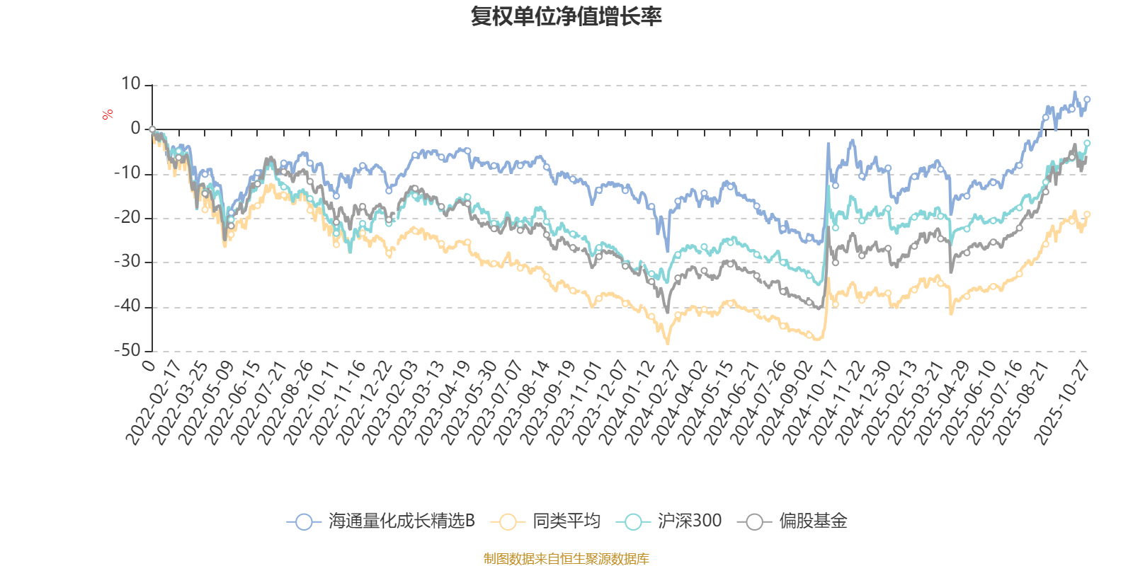 截至10月27日,海通量化成长精选B近三个月复权单位净值增长率为10.23%,位于同类可比基金451/689;近半年复权单位净值增长率为25.13%,位于同类可比基金383/688;近一年复权单位净值增长率为15.54%,位于同类可比基金508/653;近三年复权单位净值增长率为19.25%,位于同类可比基金154/364。