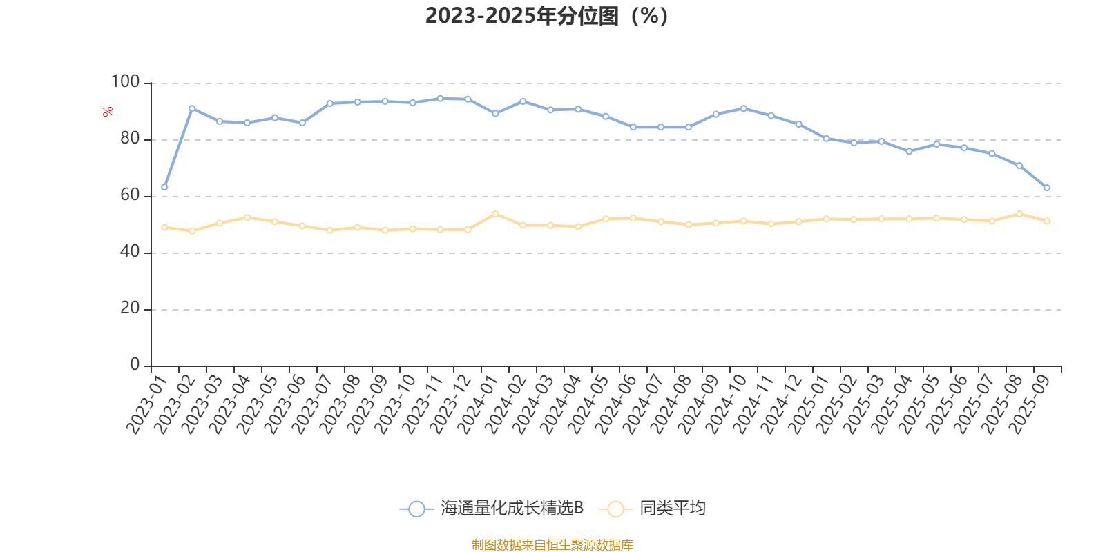 通过所选区间该基金净值增长率分位图,可以观察该基金与同类基金业绩比较情况。图为坐标原点到区间内某时点的净值增长率在同类基金中的分位数。