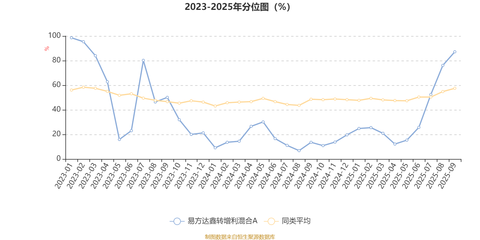 通过所选区间该基金净值增长率分位图,可以观察该基金与同类基金业绩比较情况。图为坐标原点到区间内某时点的净值增长率在同类基金中的分位数。