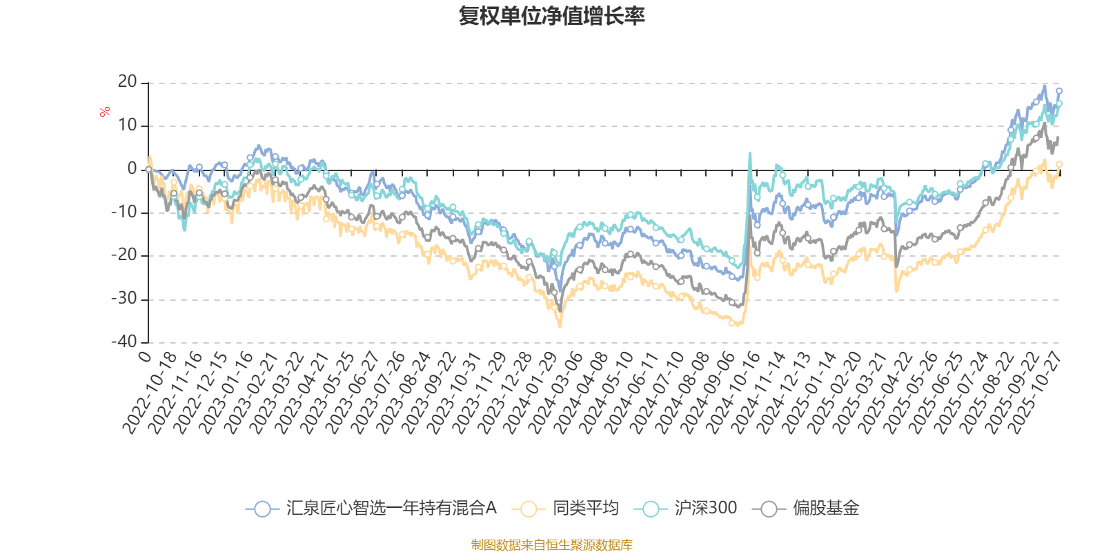 截至10月27日,汇泉匠心智选一年持有混合A近三个月复权单位净值增长率为17.32%,位于同类可比基金267/621;近半年复权单位净值增长率为30.14%,位于同类可比基金297/619;近一年复权单位净值增长率为30.23%,位于同类可比基金297/611;近三年复权单位净值增长率为20.15%,位于同类可比基金231/518。