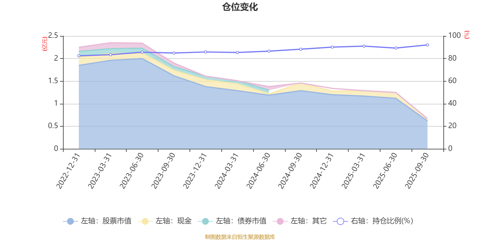 据定期报告数据统计,近三年平均股票仓位为87.12%,同类平均为85.52%。2025年三季度末基金达到92.12%的最高仓位,2022年末最低,为82.47%。