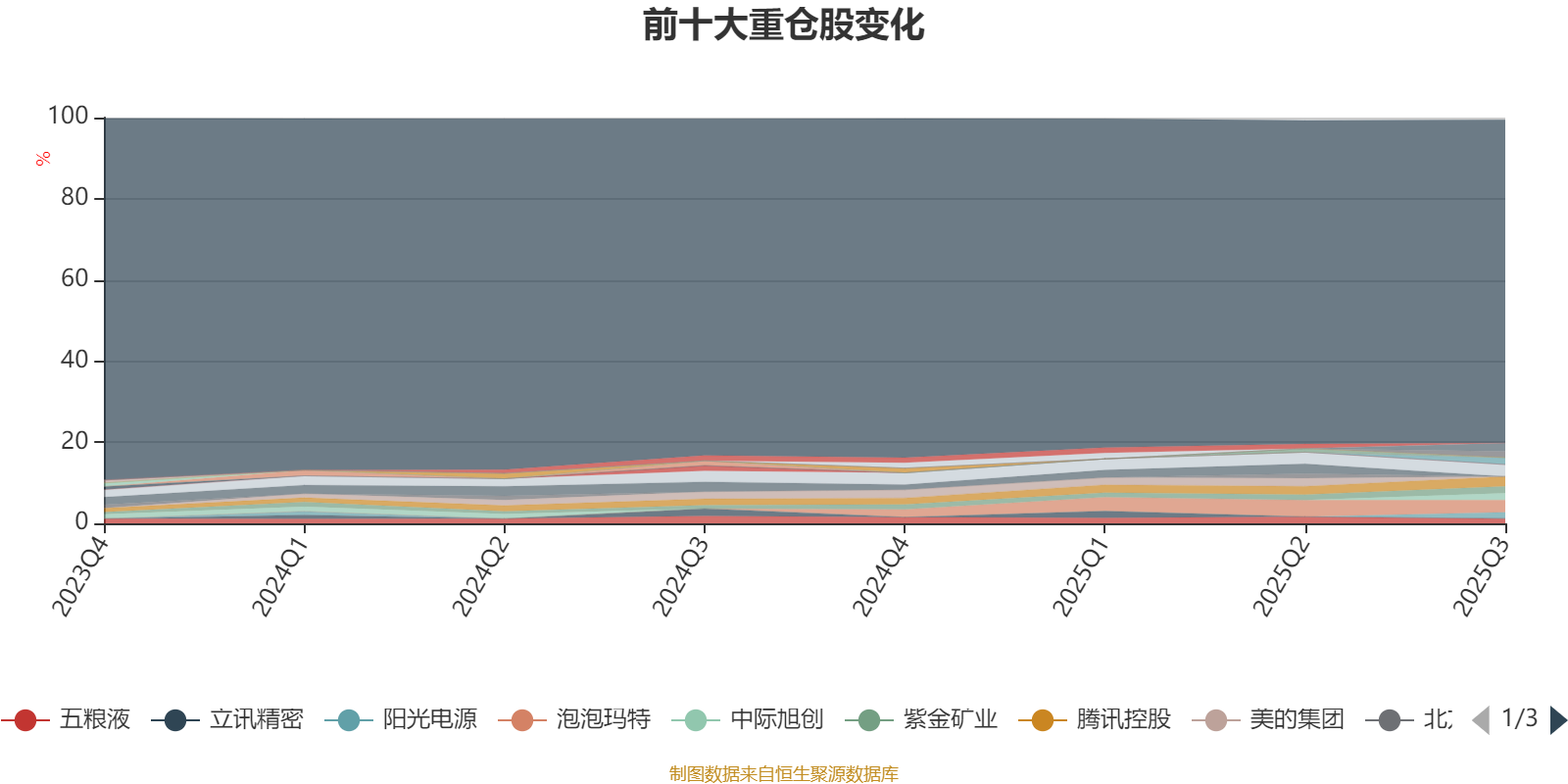 截至2025年三季度末,基金十大重仓股分别是泡泡玛特、宁德时代、腾讯控股、新易盛、寒武纪、中际旭创、紫金矿业、阳光电源、胜宏科技、五粮液。