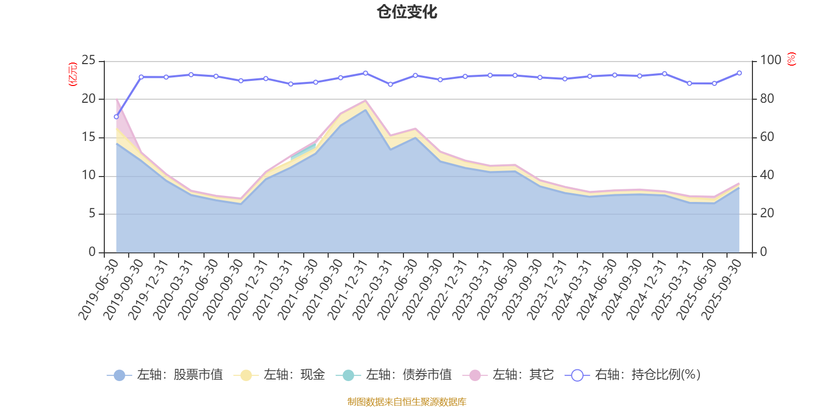 据定期报告数据统计,近三年平均股票仓位为91.67%,同类平均为85.88%。2025年三季度末基金达到93.77%的最高仓位,2019年上半年末最低,为70.92%。