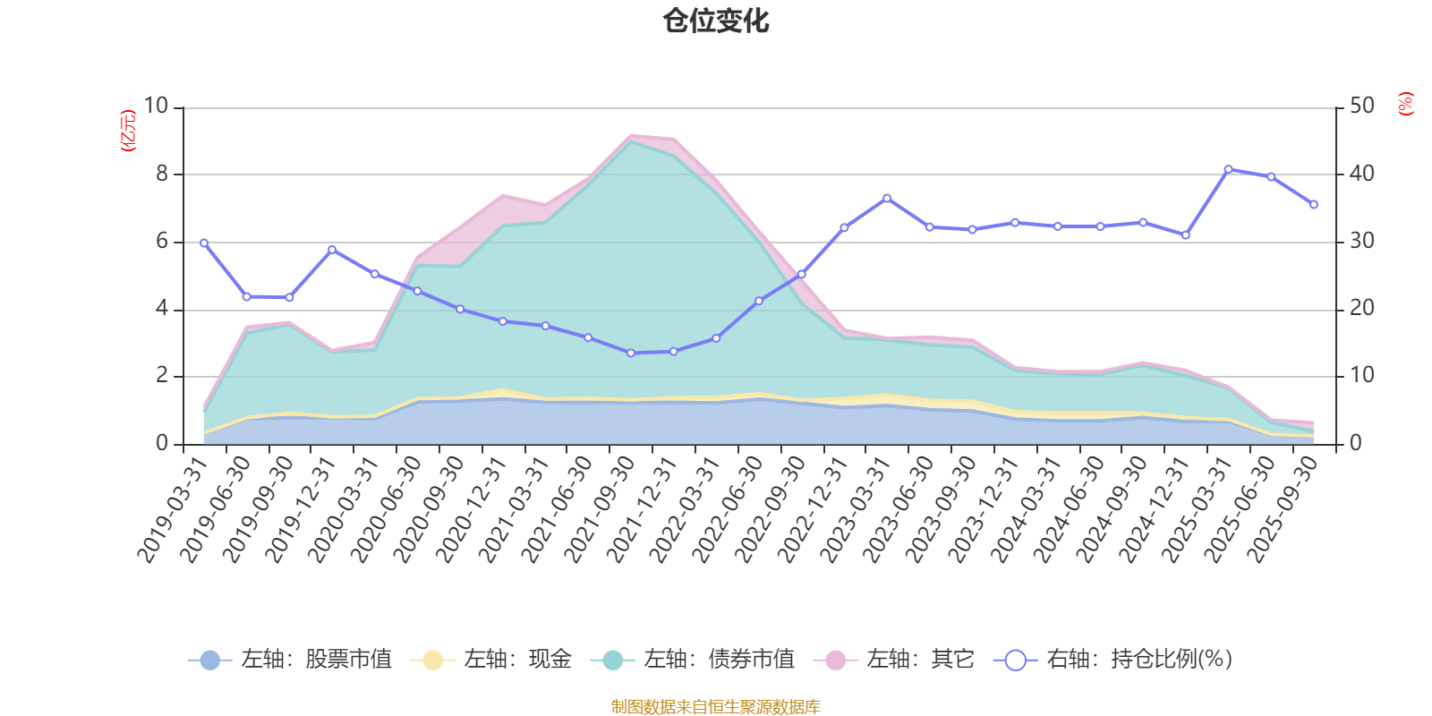 据定期报告数据统计,近三年平均股票仓位为34.21%,同类平均为72.14%。2025年一季度末基金达到40.82%的最高仓位,2021年三季度末最低,为13.56%。