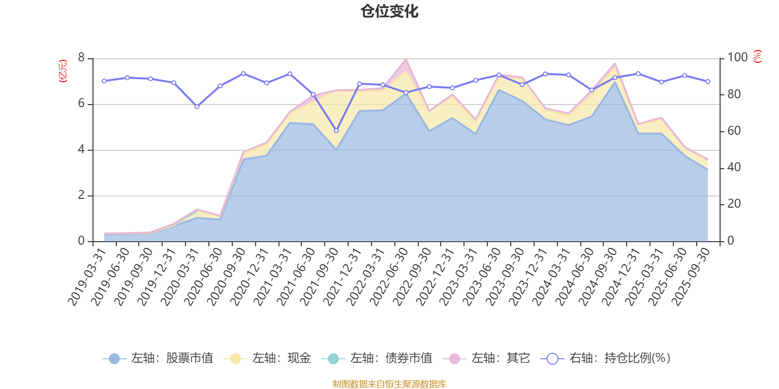 据定期报告数据统计,近三年平均股票仓位为88.32%,同类平均为72.14%。2020年三季度末基金达到91.69%的最高仓位,2021年三季度末最低,为60.53%。