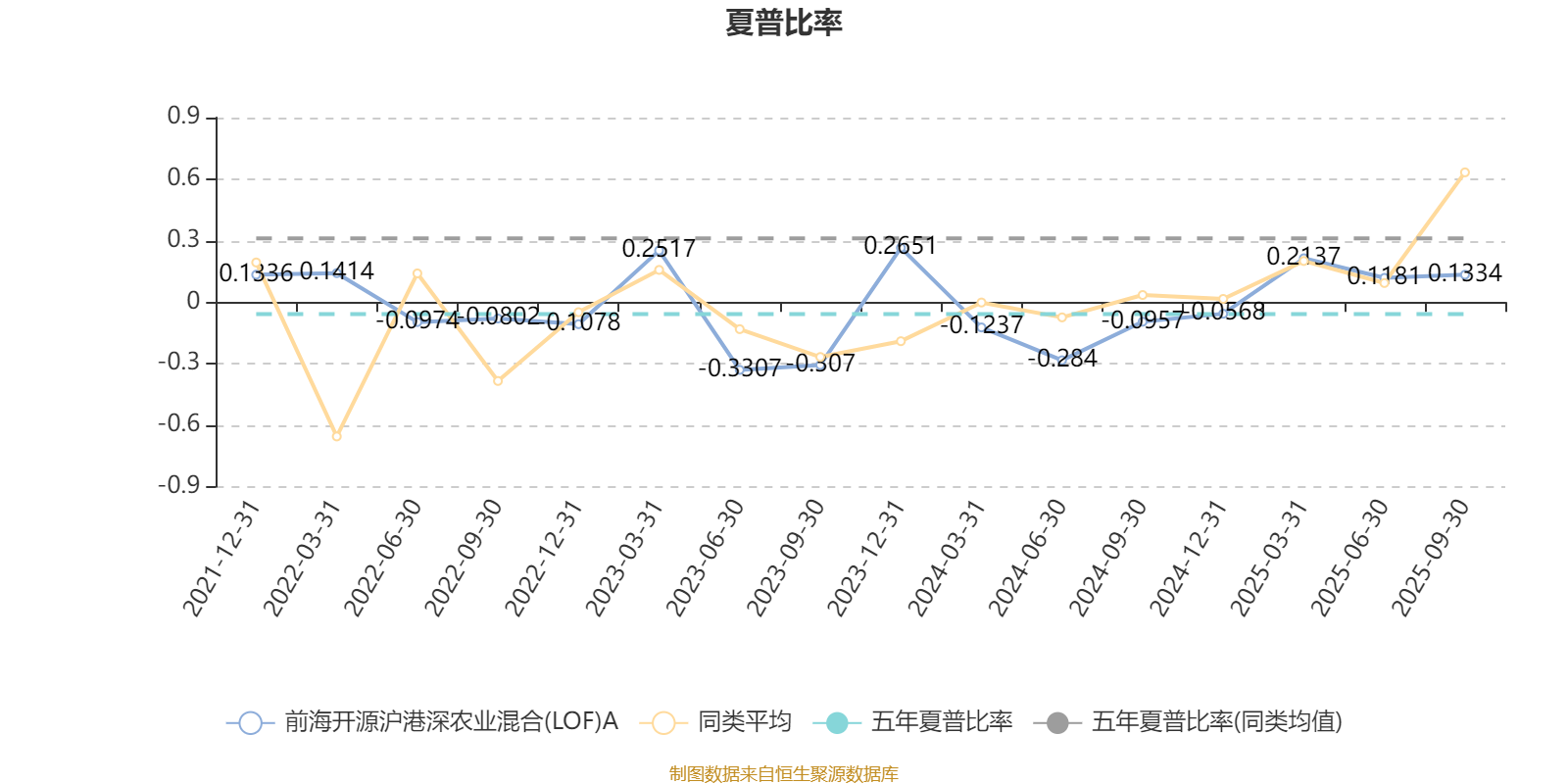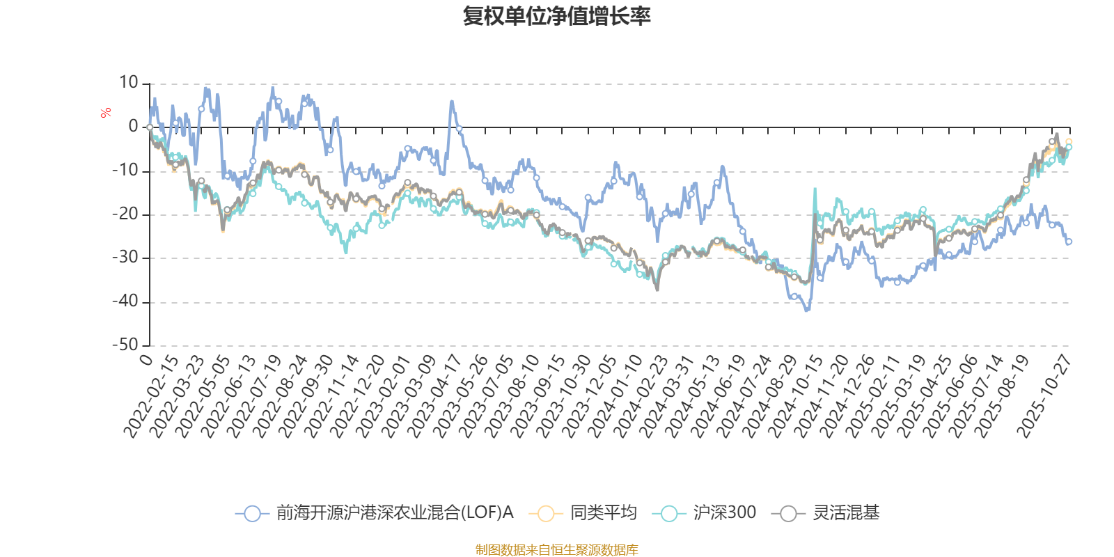 截至10月27日,前海开源沪港深农业混合(LOF)A近三个月复权单位净值增长率为-5.15%,位于同类可比基金1276/1287;近半年复权单位净值增长率为4.22%,位于同类可比基金1169/1287;近一年复权单位净值增长率为6.27%,位于同类可比基金1087/1287;近三年复权单位净值增长率为-17.29%,位于同类可比基金1204/1286。
