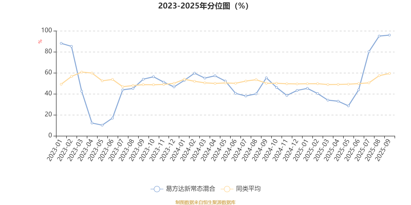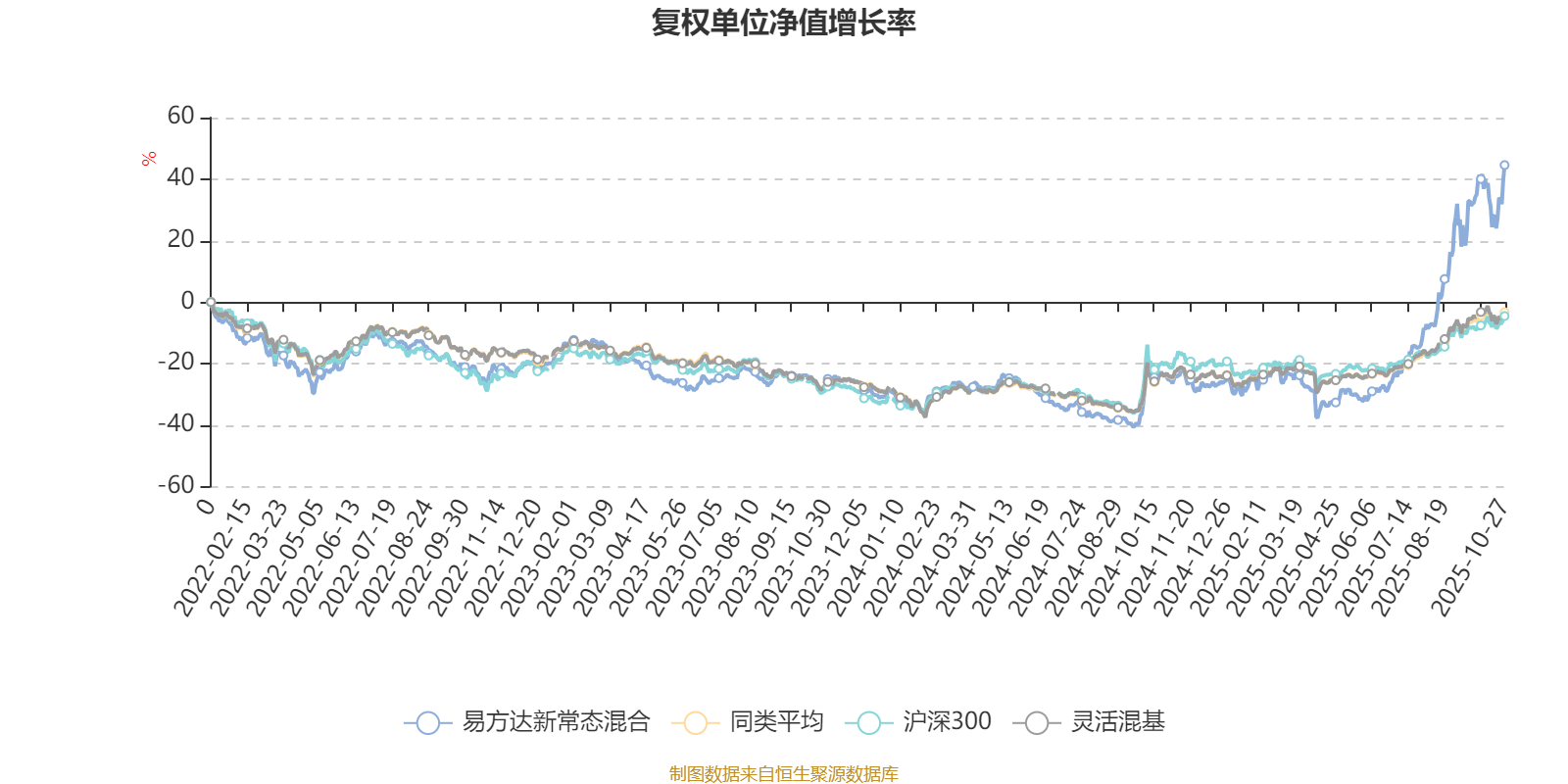 截至10月27日,易方达新常态混合近三个月复权单位净值增长率为68.07%,位于同类可比基金7/1287;近半年复权单位净值增长率为114.61%,位于同类可比基金11/1287;近一年复权单位净值增长率为88.83%,位于同类可比基金26/1287;近三年复权单位净值增长率为93.41%,位于同类可比基金25/1286。