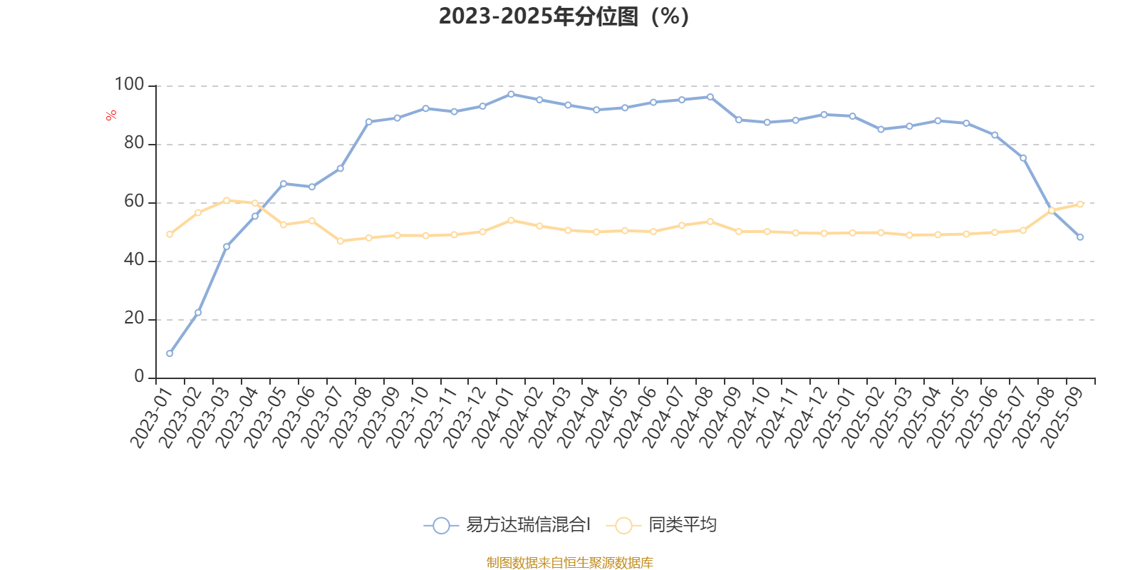 通过所选区间该基金净值增长率分位图,可以观察该基金与同类基金业绩比较情况。图为坐标原点到区间内某时点的净值增长率在同类基金中的分位数。