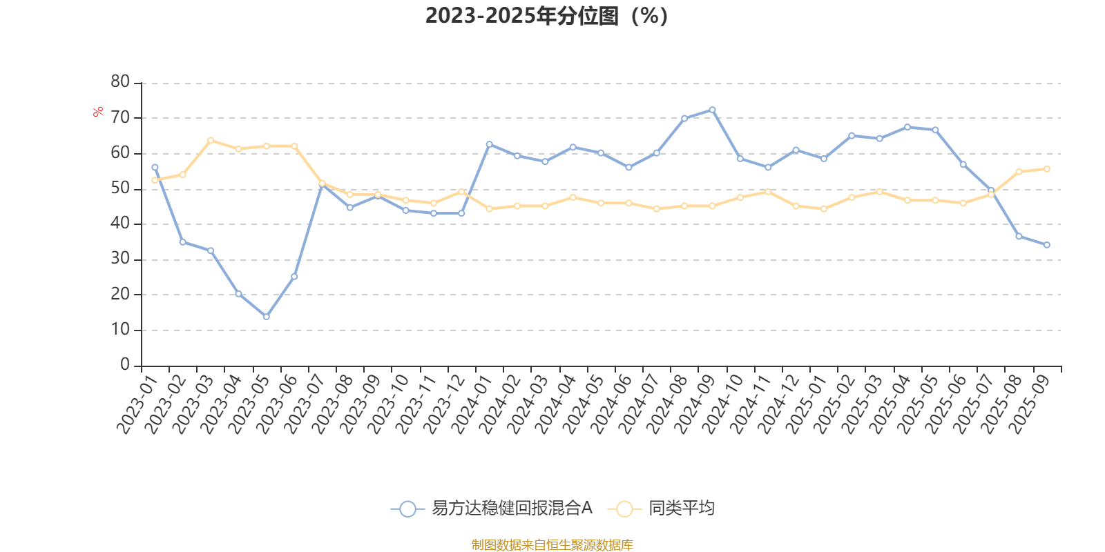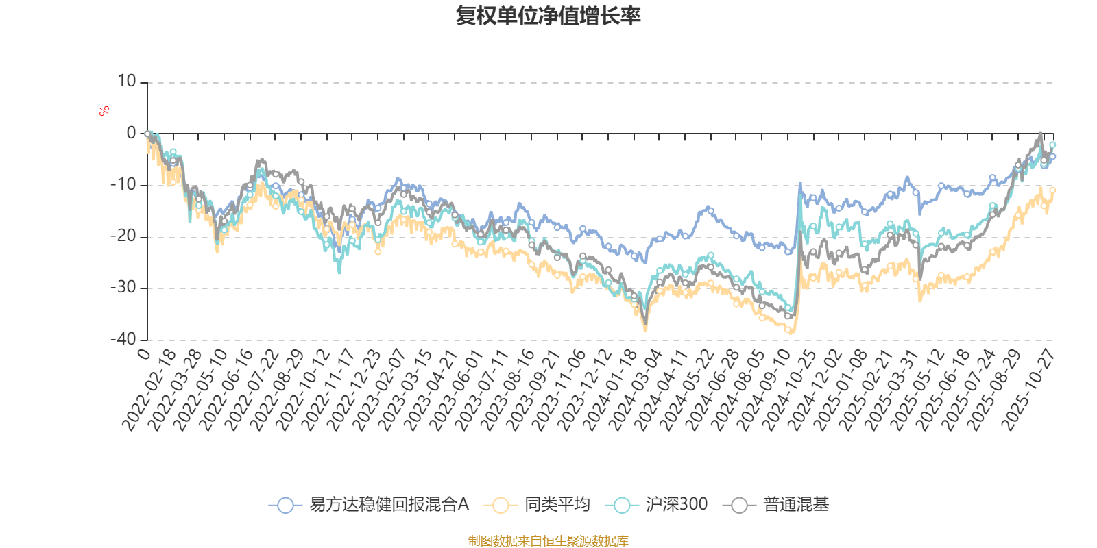截至10月27日,易方达稳健回报混合A近三个月复权单位净值增长率为5.05%,位于同类可比基金103/134;近半年复权单位净值增长率为9.68%,位于同类可比基金111/134;近一年复权单位净值增长率为9.12%,位于同类可比基金104/130;近三年复权单位净值增长率为21.30%,位于同类可比基金52/119。
