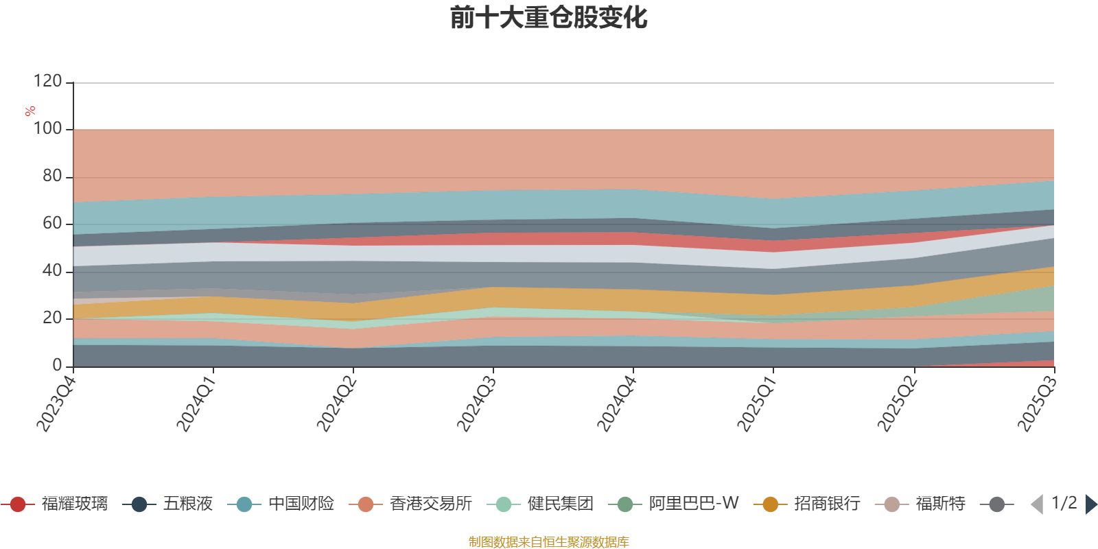 该基金持股集中度较高,且持股标的较为稳定,近2年前十大重仓股集中度长期超过60%。截至2025年三季度末,基金十大重仓股分别是贵州茅台、腾讯控股、阿里巴巴-W、香港交易所、招商银行、五粮液、宝丰能源、美的集团、中国财险、福耀玻璃。