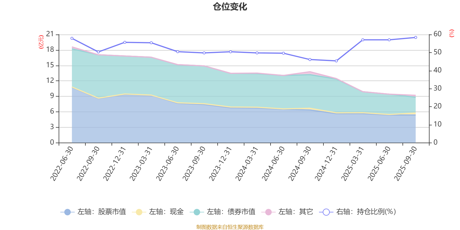 据定期报告数据统计,近三年平均股票仓位为52.1%,同类平均为67.21%。2025年三季度末基金达到58.37%的最高仓位,2024年末最低,为45.36%。