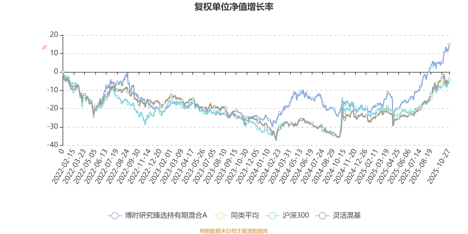 截至10月27日,博时研究臻选持有期混合A近三个月复权单位净值增长率为17.28%,位于同类可比基金462/1287;近半年复权单位净值增长率为43.29%,位于同类可比基金225/1287;近一年复权单位净值增长率为38.15%,位于同类可比基金281/1287;近三年复权单位净值增长率为36.80%,位于同类可比基金250/1286。