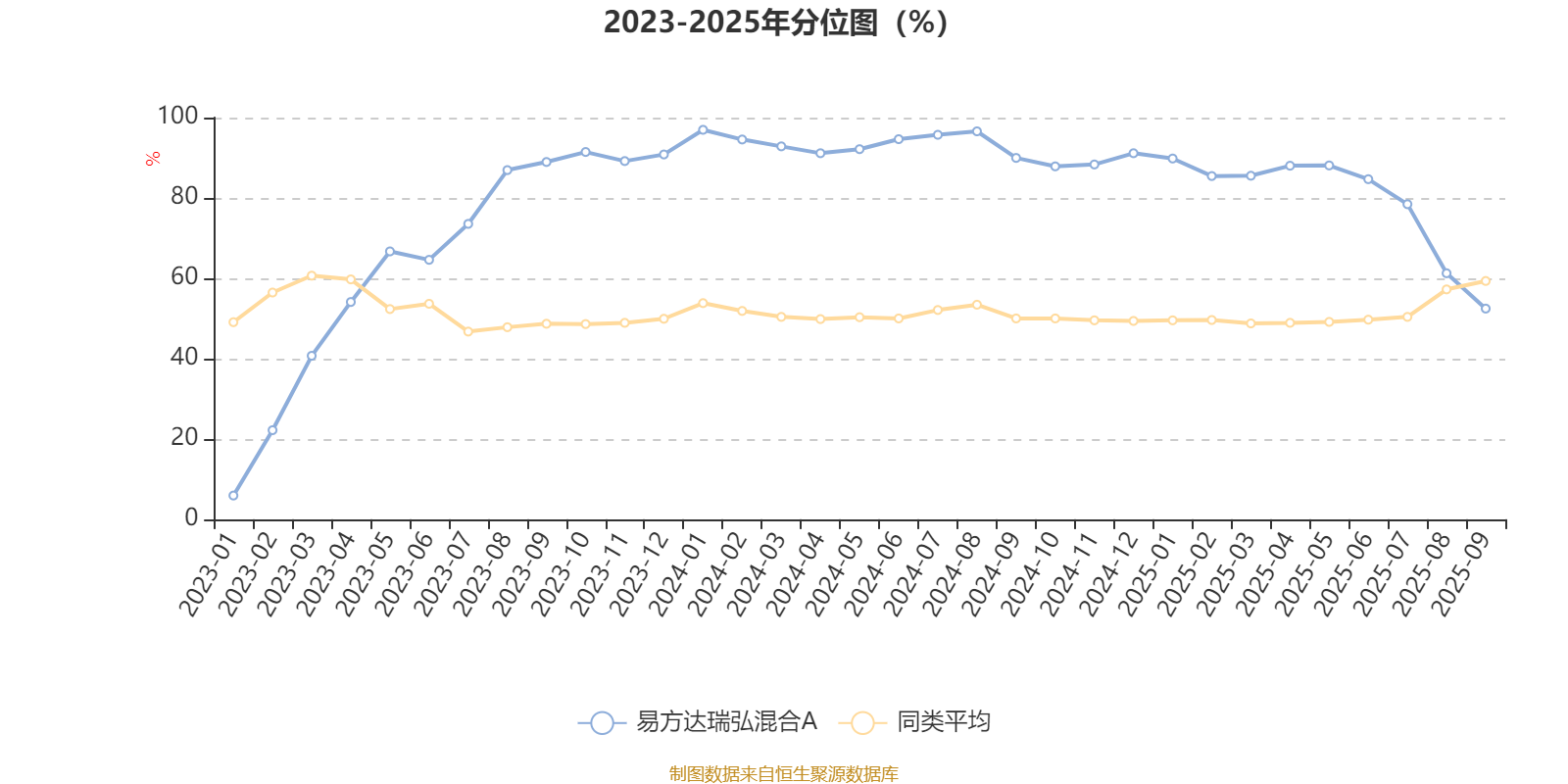 通过所选区间该基金净值增长率分位图,可以观察该基金与同类基金业绩比较情况。图为坐标原点到区间内某时点的净值增长率在同类基金中的分位数。