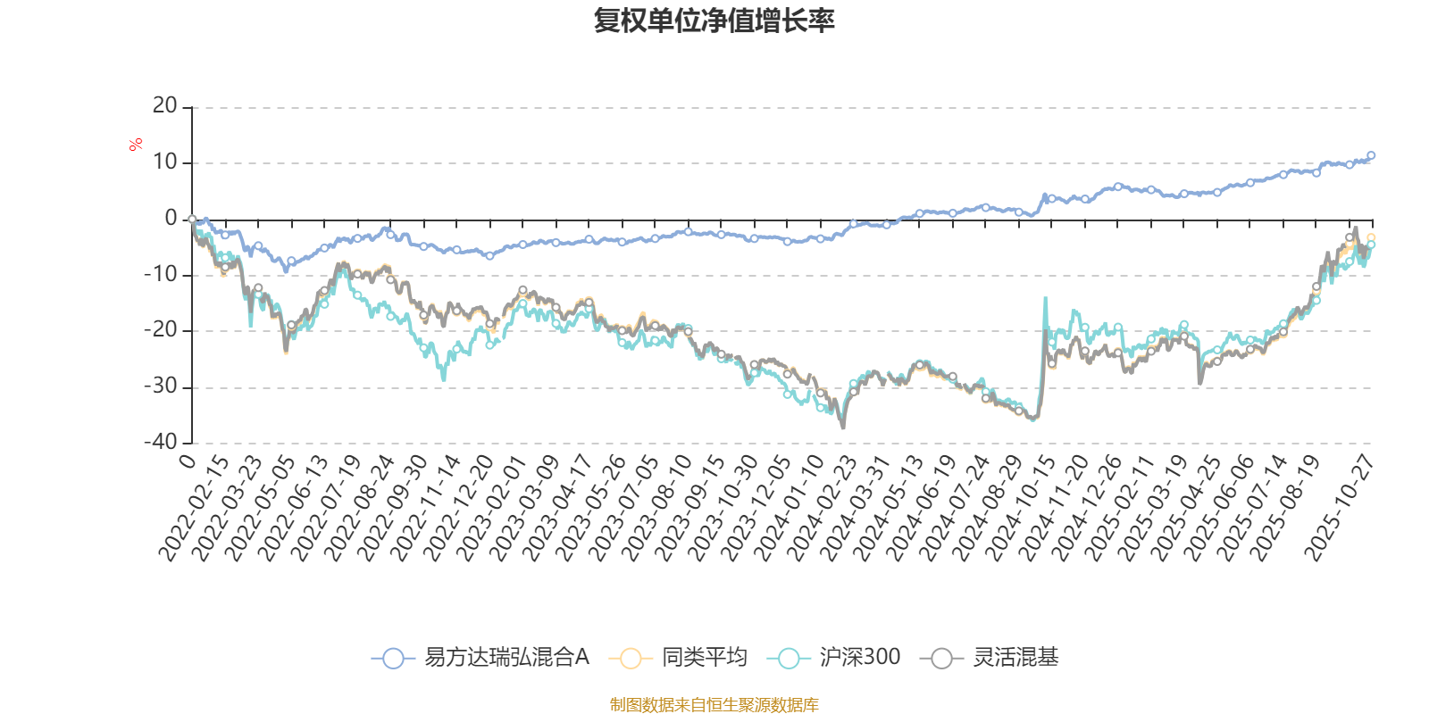 截至10月27日,易方达瑞弘混合A近三个月复权单位净值增长率为2.67%,位于同类可比基金1061/1287;近半年复权单位净值增长率为6.32%,位于同类可比基金1108/1287;近一年复权单位净值增长率为7.72%,位于同类可比基金1037/1287;近三年复权单位净值增长率为17.96%,位于同类可比基金571/1286。