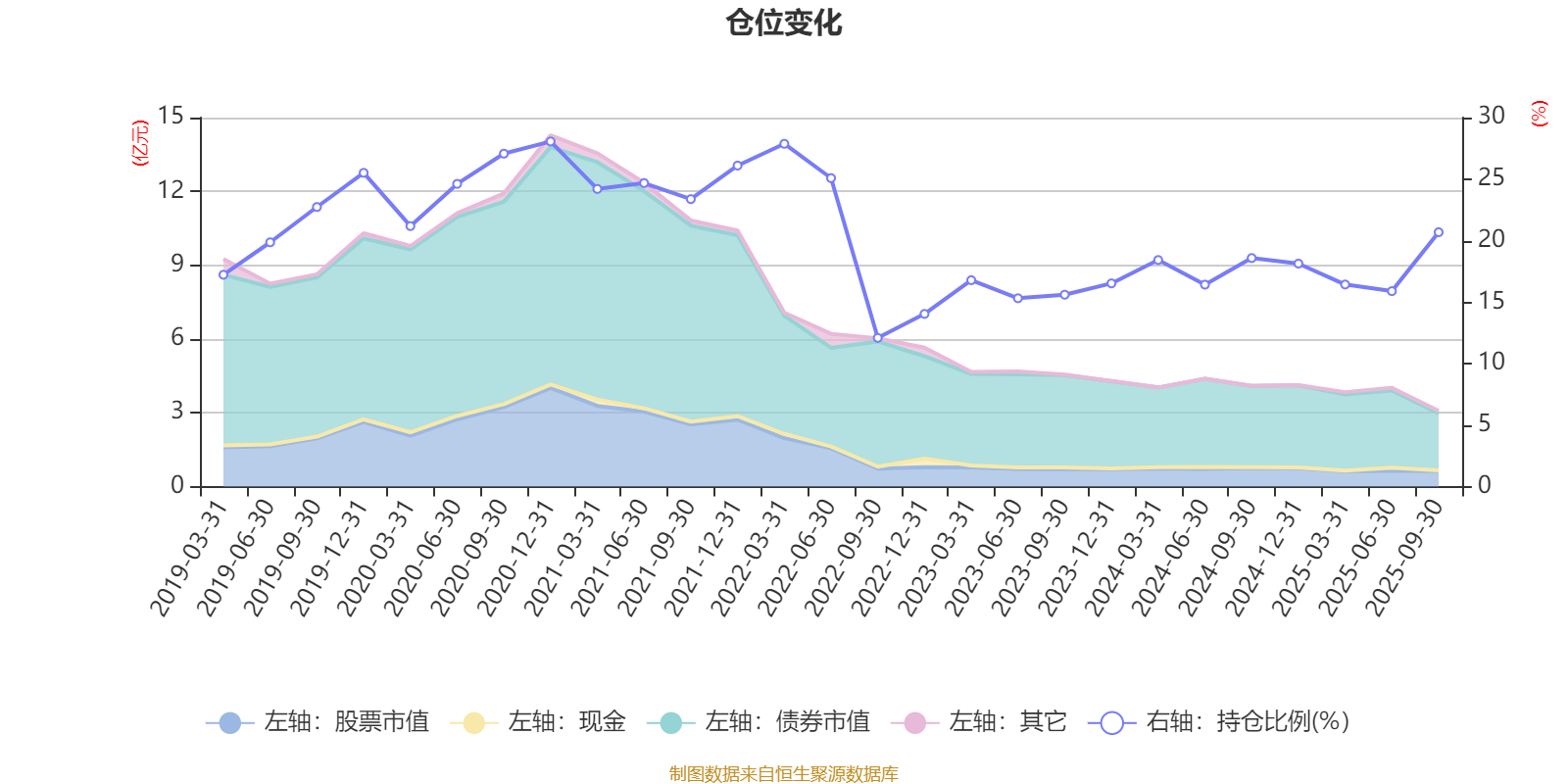 据定期报告数据统计,近三年平均股票仓位为16.9%,同类平均为72.14%。2020年末基金达到28.06%的最高仓位,2022年三季度末最低,为12.09%。