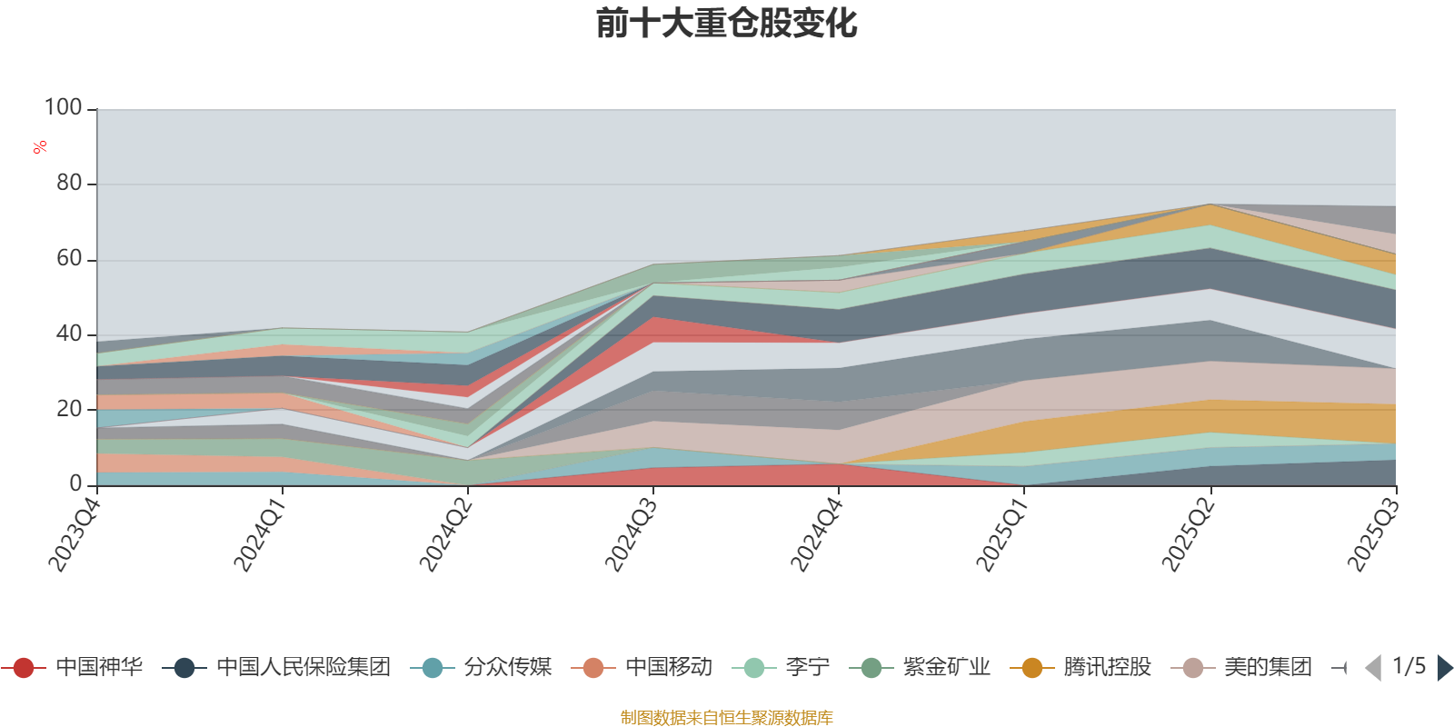 截至2025年三季度末,基金十大重仓股分别是宁德时代、腾讯控股、中国财险、美的集团、阿里巴巴-W、中国人民保险集团、马应龙、法拉电子、分众传媒、招商银行。
