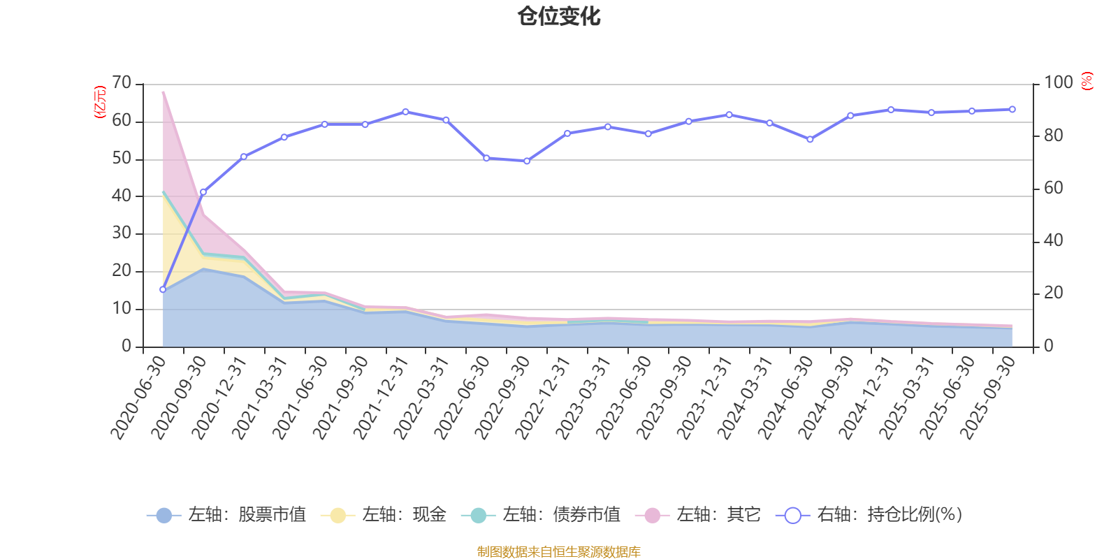 据定期报告数据统计,近三年平均股票仓位为85.93%,同类平均为72.17%。2025年三季度末基金达到90.33%的最高仓位,2020年上半年末最低,为21.84%。
