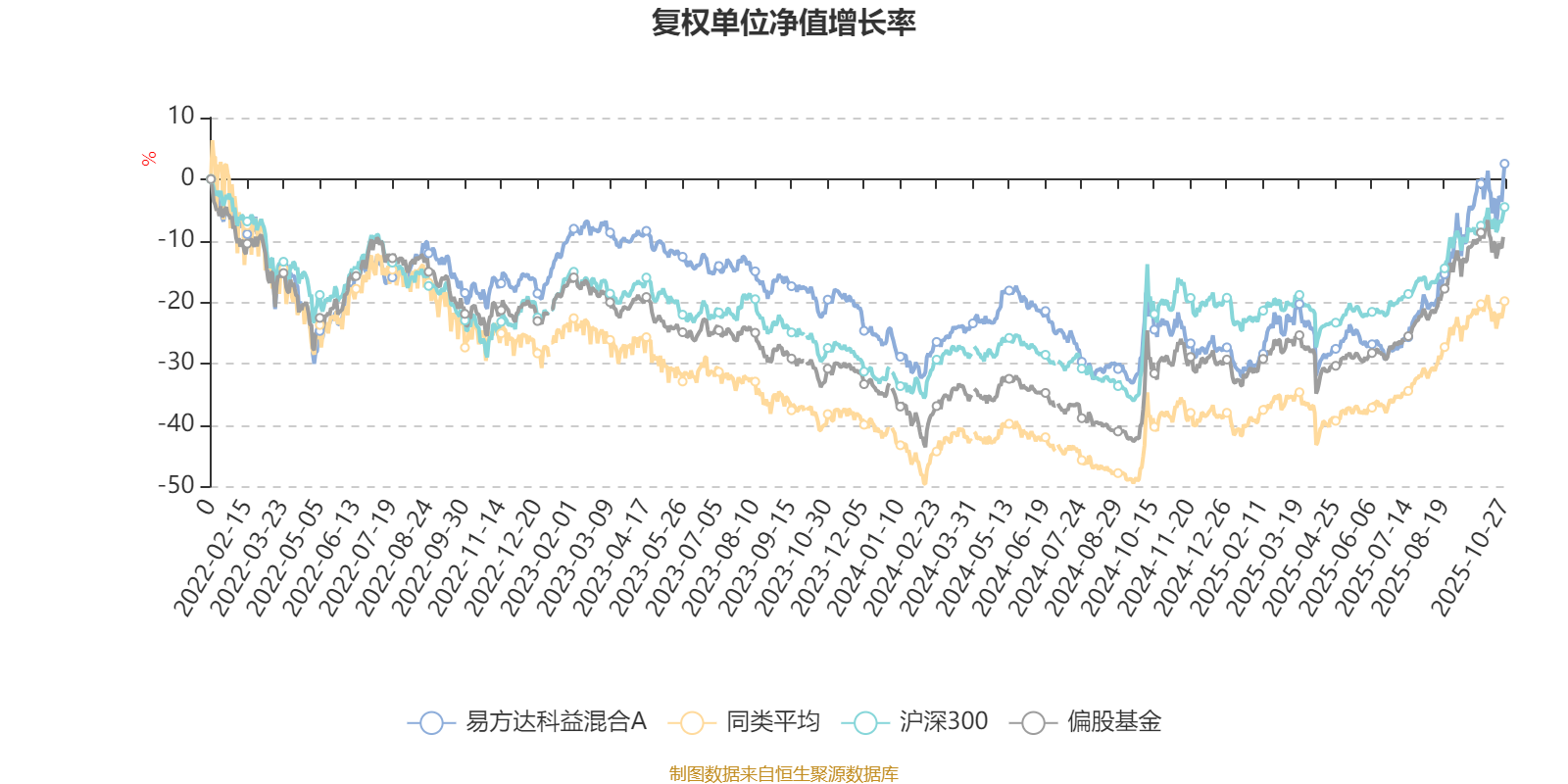 截至10月27日,易方达科益混合A近三个月复权单位净值增长率为30.95%,位于同类可比基金77/621;近半年复权单位净值增长率为41.58%,位于同类可比基金134/619;近一年复权单位净值增长率为33.69%,位于同类可比基金253/611;近三年复权单位净值增长率为26.29%,位于同类可比基金185/518。