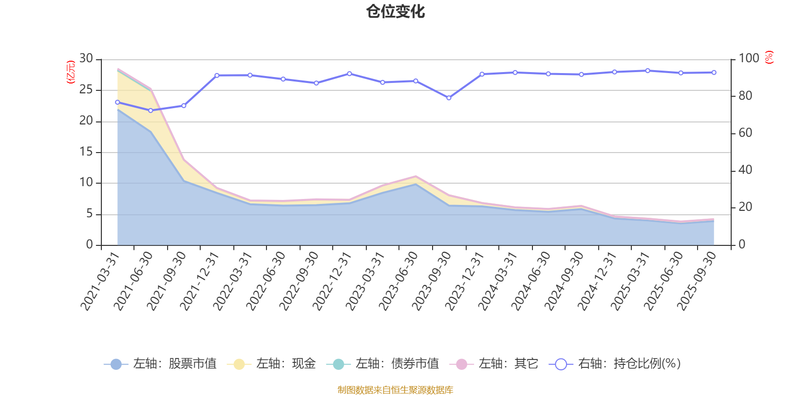 据定期报告数据统计,近三年平均股票仓位为90.73%,同类平均为85.52%。2025年一季度末基金达到93.87%的最高仓位,2021年上半年末最低,为72.43%。