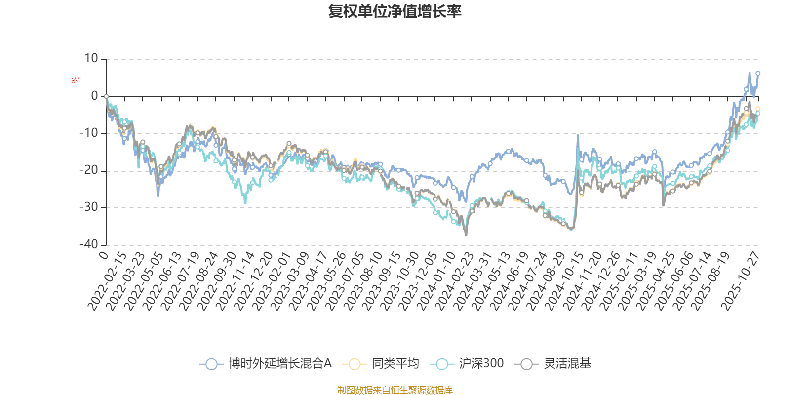 截至10月27日,博时外延增长混合A近三个月复权单位净值增长率为22.50%,位于同类可比基金340/1287;近半年复权单位净值增长率为33.35%,位于同类可比基金415/1287;近一年复权单位净值增长率为26.04%,位于同类可比基金544/1287;近三年复权单位净值增长率为30.72%,位于同类可比基金334/1286。