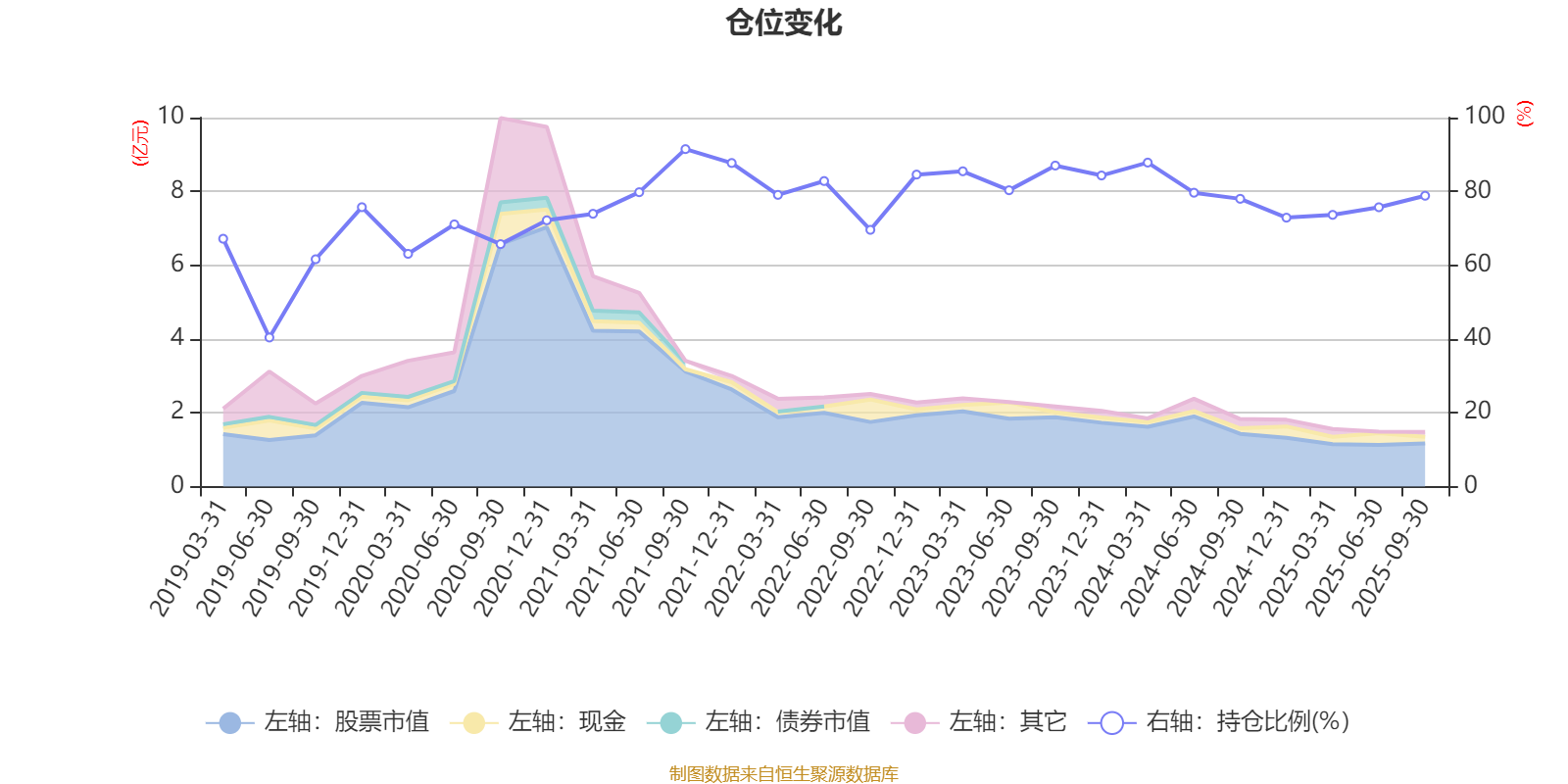 据定期报告数据统计,近三年平均股票仓位为80.68%,同类平均为72.17%。2021年三季度末基金达到91.46%的最高仓位,2019年上半年末最低,为40.4%。