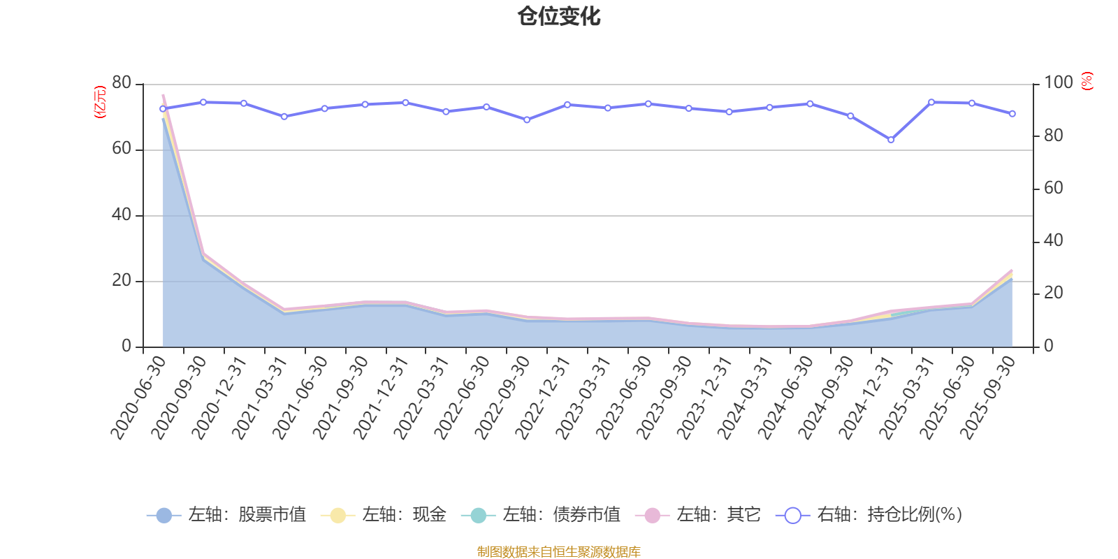 据定期报告数据统计,近三年平均股票仓位为89.98%,同类平均为85.88%。2020年三季度末基金达到93.03%的最高仓位,2024年末最低,为78.75%。