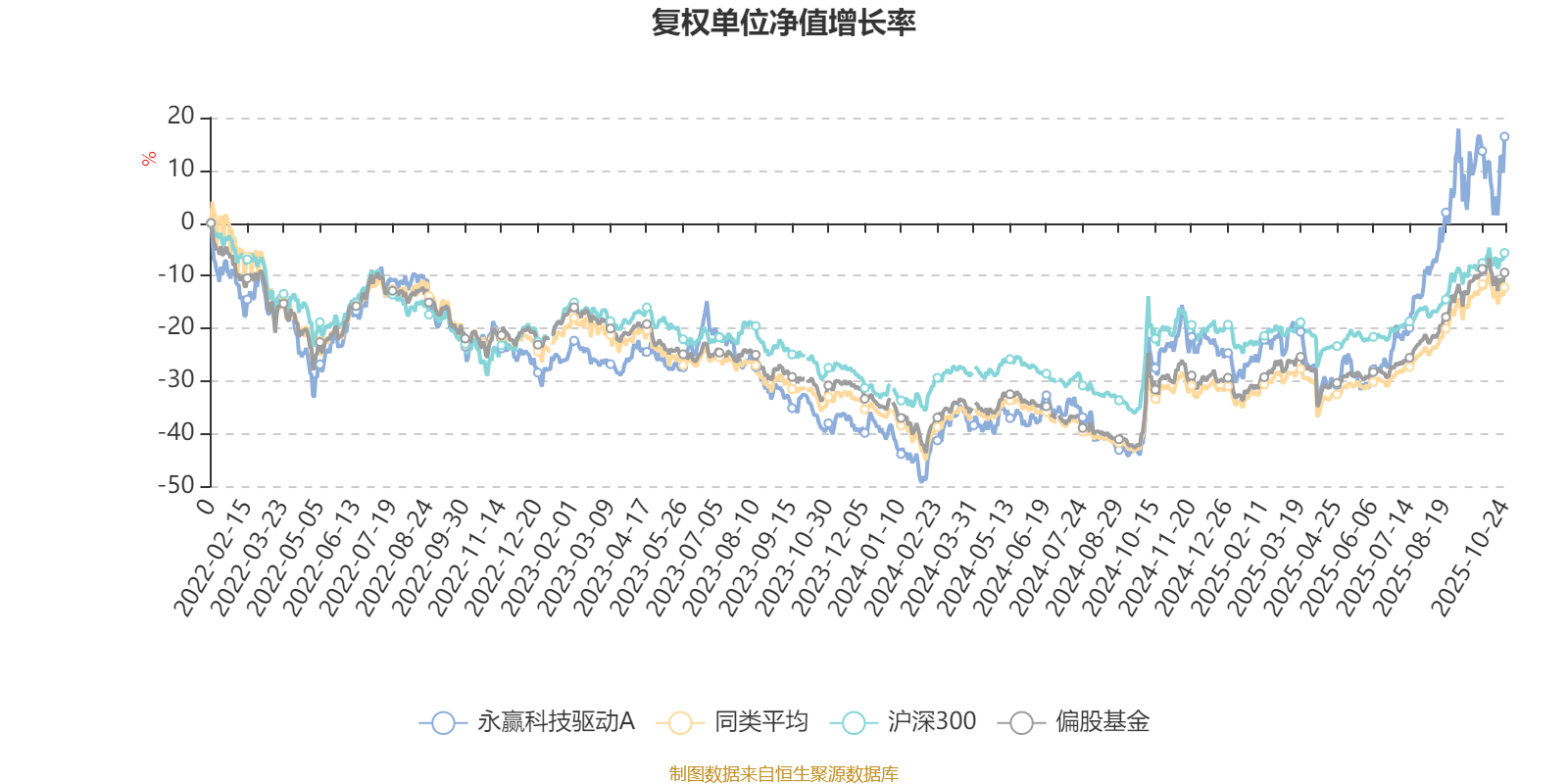截至10月24日,永赢科技驱动A近三个月复权单位净值增长率为35.33%,位于同类可比基金21/265;近半年复权单位净值增长率为69.53%,位于同类可比基金8/265;近一年复权单位净值增长率为53.87%,位于同类可比基金28/265;近三年复权单位净值增长率为49.51%,位于同类可比基金24/253。